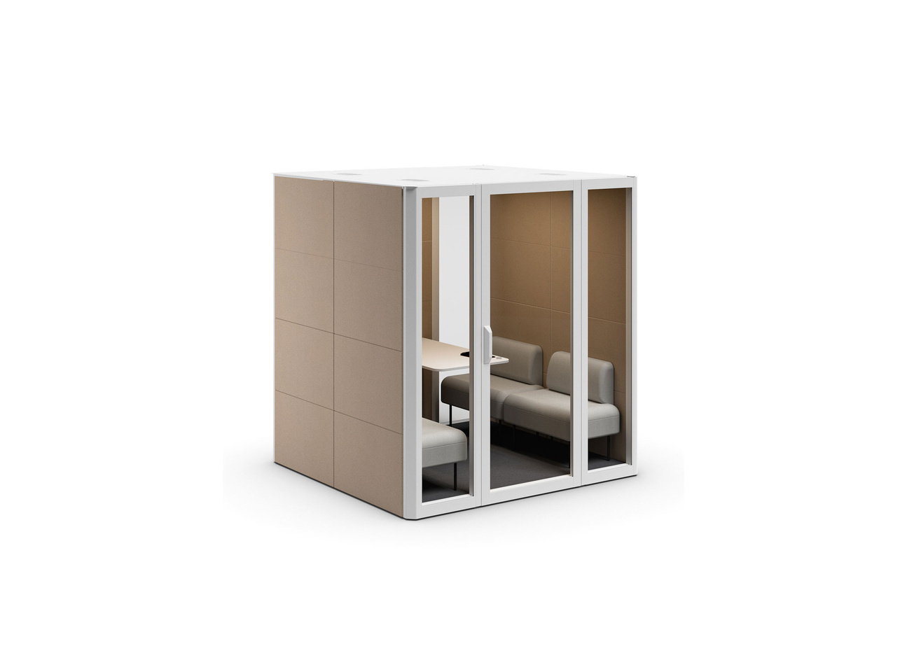 Qyos 400 ist eine Kabine für bis zu vier Personen, die für Gruppensitzungen, Co-Creation-Sitzungen von Angesicht zu Angesicht oder Videokonferenzen im Team konzipiert ist. Sie bietet eine private, komfortable Umgebung mit hervorragender akustischer Isolierung, ideal zur Förderung der Zusammenarbeit und des Ideenaustauschs in offenen Räumen ohne Unterbrechungen von außen.