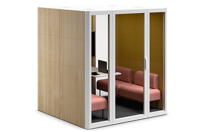 Qyos 600 ist eine geräumige Kabine für bis zu sechs Personen, ideal für Gruppenbesprechungen, persönliche Co-Creation-Sitzungen, Gruppen-Videokonferenzen oder als privates Büro. Er bietet eine komfortable, ruhige und funktionale Umgebung, die Privatsphäre und Konzentration in offenen Räumen gewährleistet und so die Produktivität und ungestörte Zusammenarbeit fördert.
