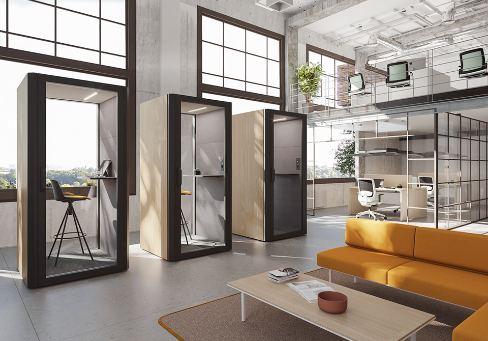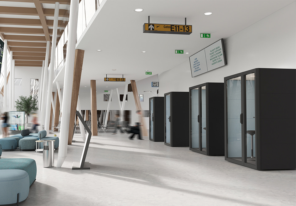 Qyos sorgt für Schalldämmung, Ergonomie und Komfort: verglaste Wände, Belüftung, Konnektivität und LED-Beleuchtung tragen zum optimalen Wohlbefinden in der Kabine bei.