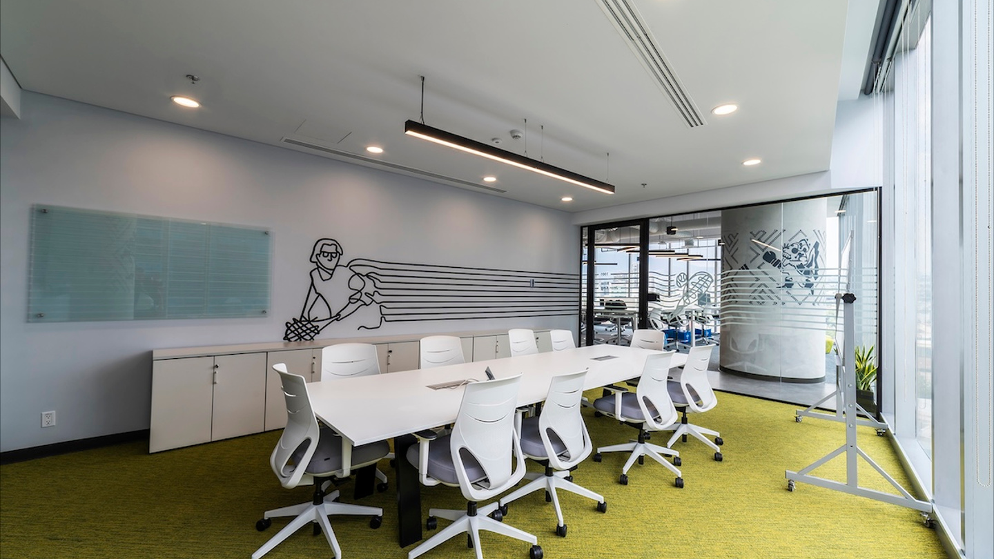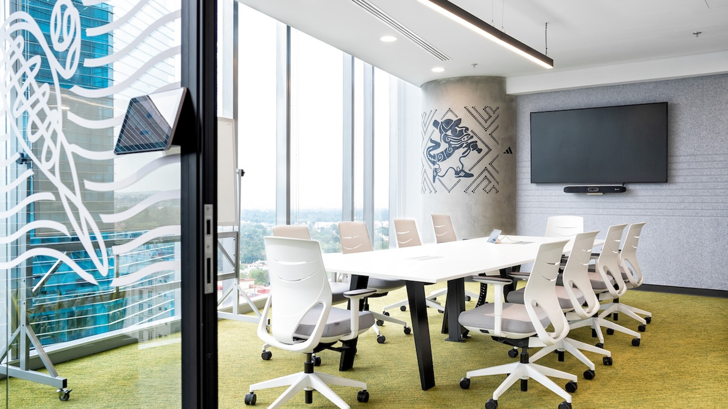 Dank der Maximierung des natürlichen Tageslichts wurde die Abhängigkeit von künstlicher Beleuchtung vermieden und eine gesunde Arbeitsumgebung gefördert. Elemente wie Zimmerpflanzen oder die grüne Wand, die das ikonische Adidas-Logo trägt, betonen die Verbindung zur Natur. Die Bürogestaltung spiegelt den Einsatz der Marke für das Wohlbefinden der Mitarbeiter, Nachhaltigkeit und ein Design mit einer starken lokalen Identität wider.