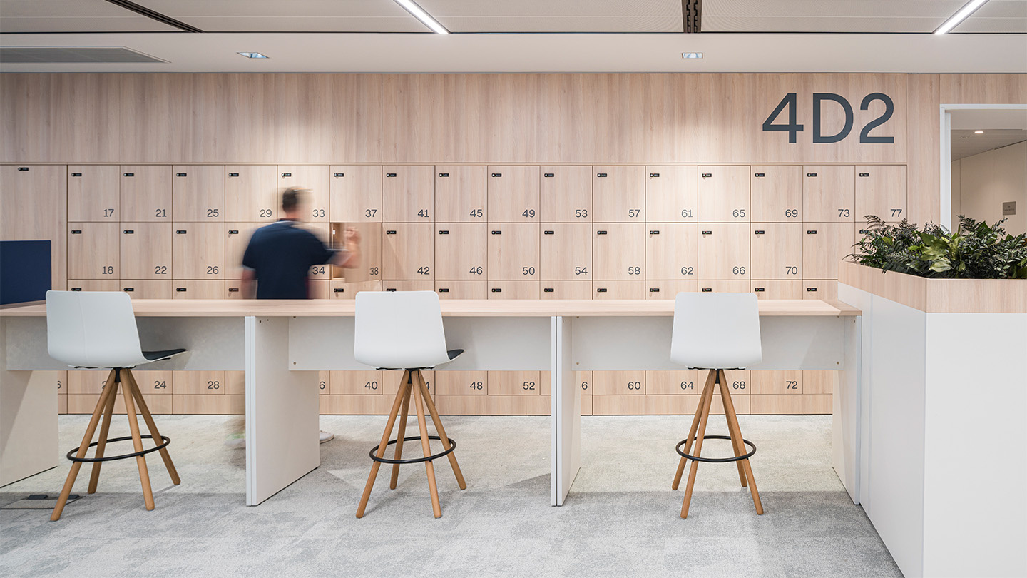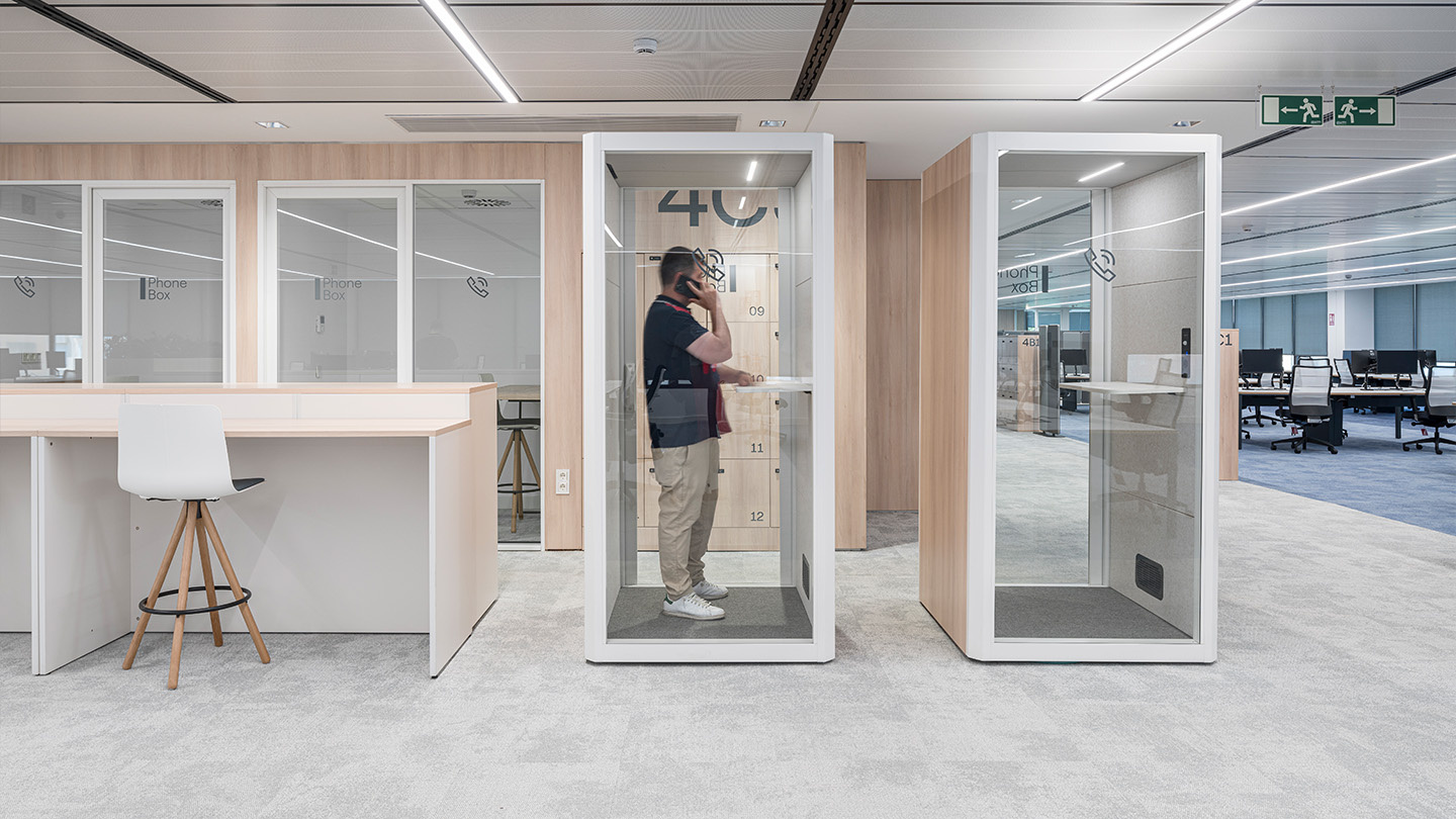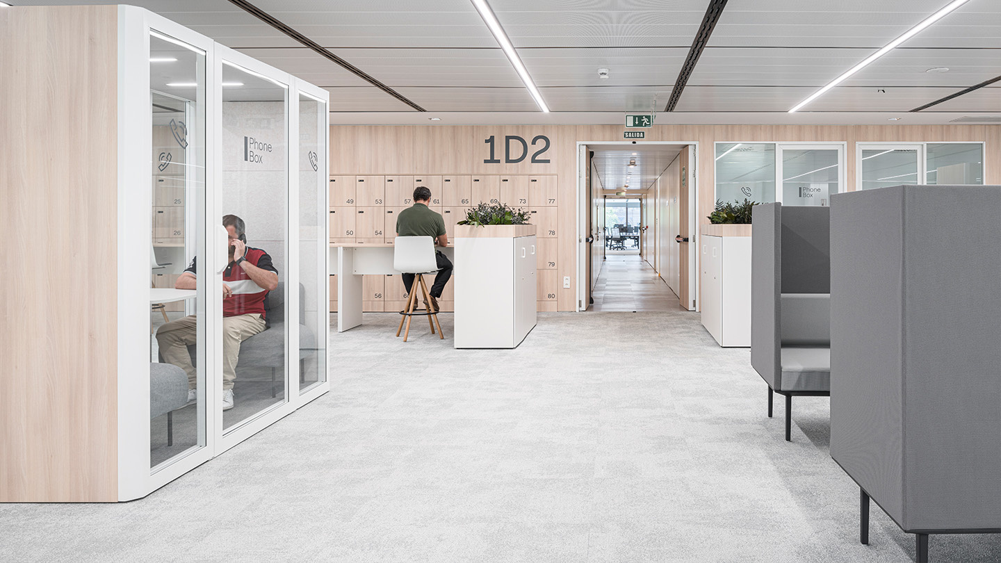 Um einen höheren akustischen Komfort zu erreichen und den Arbeitnehmern private Ecken zu bieten, in denen sie sich konzentrieren, treffen oder telefonieren können, ohne gestört zu werden, sind schallisolierte Kabinen von Qyos eingestreut; der Raum ist mit entspannenden Tönen und natürlichen Materialien wie Holz und gefriergetrockneter Vegetation gefüllt, sowohl in den Trennwänden als auch in den Pflanzgefäßen, die die modularen Lagerschränke krönen und das Wohlbefinden fördern.