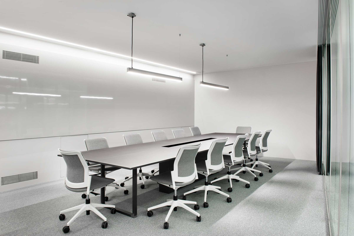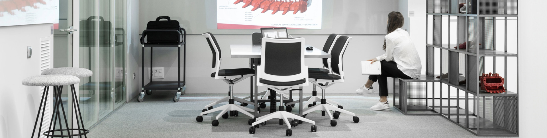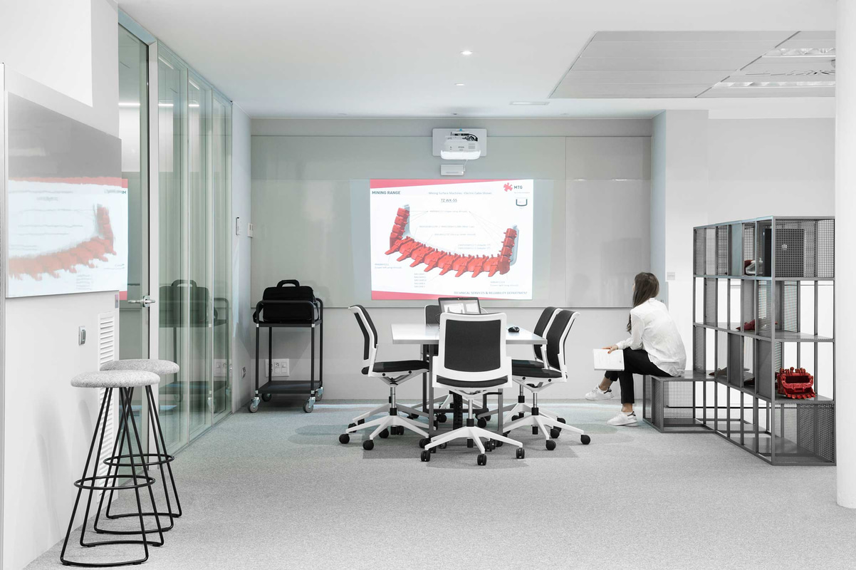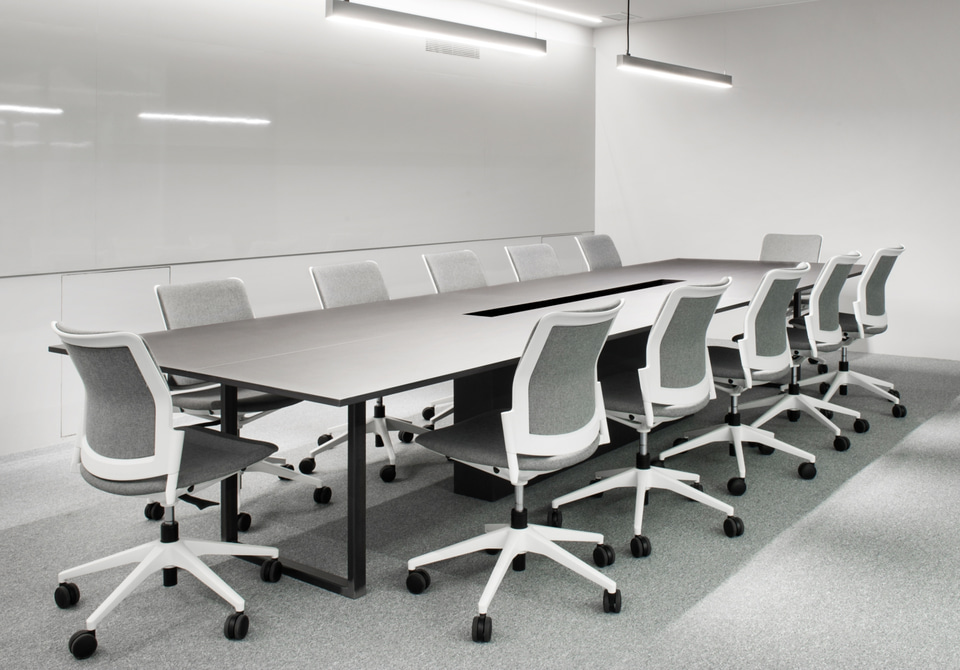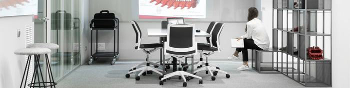 Für die Besprechungsräume wurden Urban-Stühle ohne Armlehnen mit einem Fünfspeichenfuß auf Rollen gewählt, die in der gleichen Farbpalette gepolstert sind, die auch die Farben des gesamten Projekts bestimmt. Eine "volle Farbe" in Grautönen mit einer großen Anzahl von Texturen und Schattierungen, unter denen das Starprodukt des Unternehmens hervorsticht: die roten Teile der Baggerschaufeln.