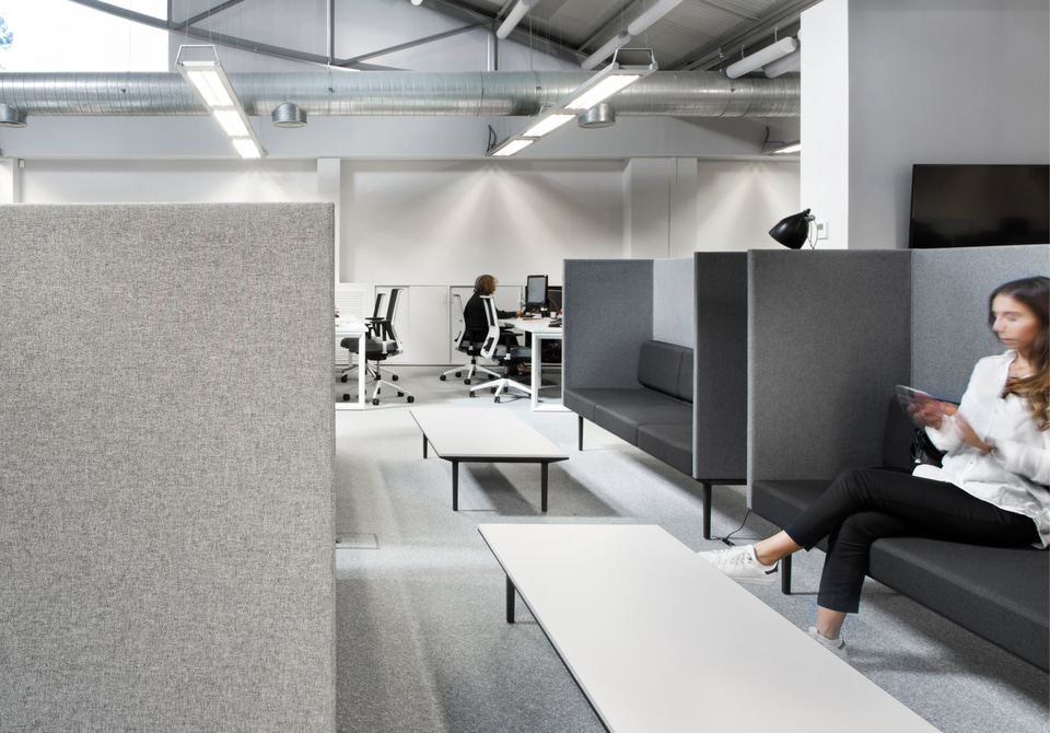 Darüber hinaus wurden verschiedene Bereiche geschaffen, um den unterschiedlichen Arbeitsweisen des Teams gerecht zu werden. Es gibt Bereiche, in denen im Stehen gearbeitet werden kann, mit an der Wand befestigten oder mobilen Whiteboards auf Rädern und einem Stehtisch mit Hockern, die Bewegung und Treffen zwischen den Mitarbeitern fördern, und andere, die intimer und gemütlicher sind, in denen man sich zurückziehen, telefonieren oder abschalten kann.