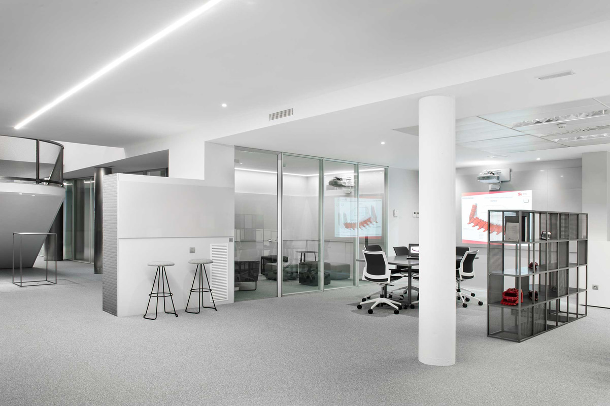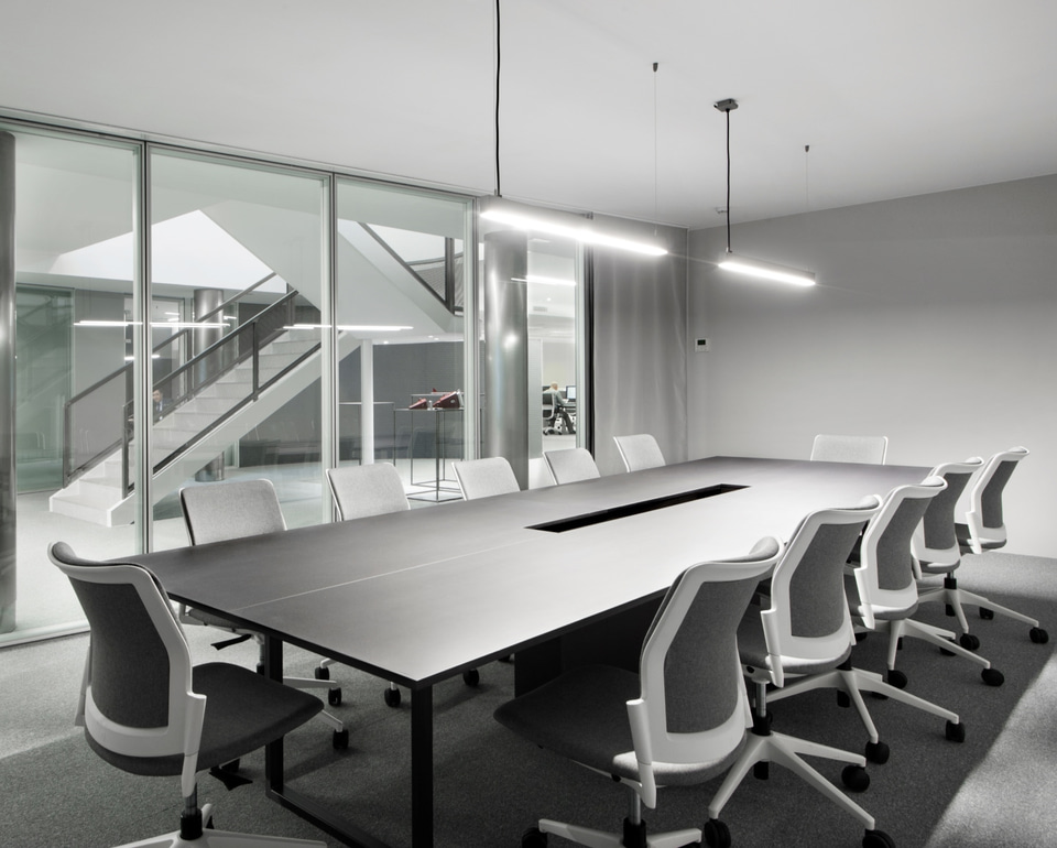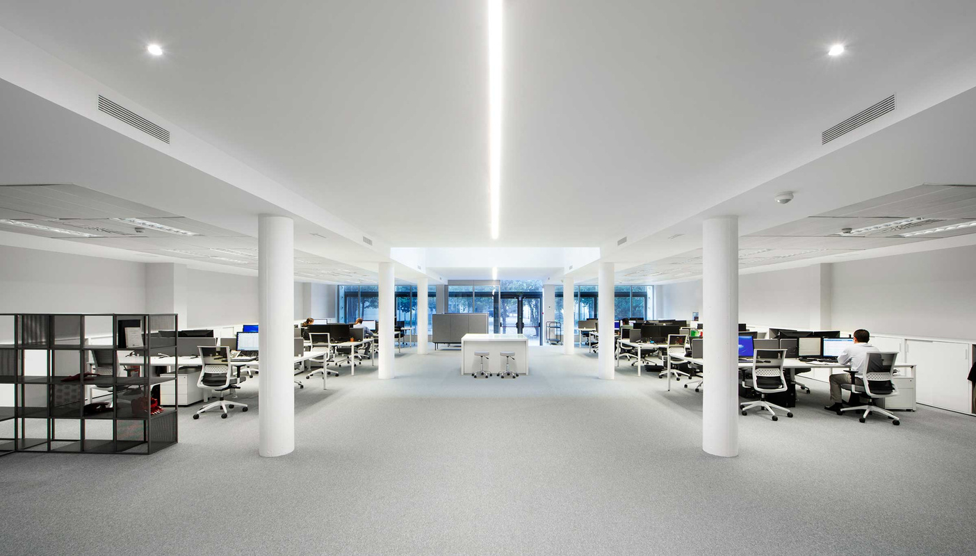 Obwohl die Organisation des Unternehmens klassisch und hierarchisch ist, mit geschlossenen Büros für die Geschäftsleitung und den anderen - meist festen - Positionen im offenen Raum, wurde Wert auf sehr komfortable Layouts und ausreichend Platz zwischen den Schreibtischen gelegt. Mit offenen Räumen, Großzügigkeit, Klarheit und Verbindung bietet der neue Hauptsitz ein gesundes Arbeitsumfeld, das für verschiedene Aufgaben geeignet ist und in dem jeder seinen persönlichen Raum hat, um individuell zu arbeiten.