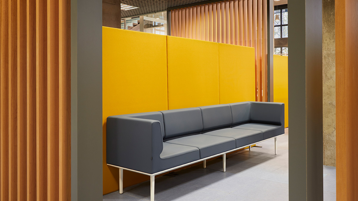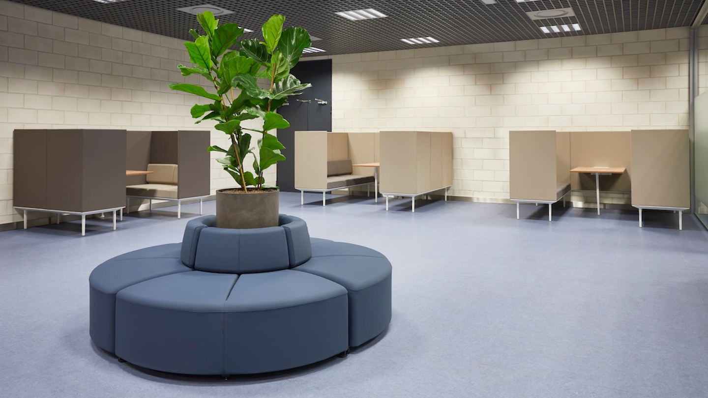 Auf der SEPE-Etage ist der Wartebereich mit Holzlamellen in mehrere Abschnitte unterteilt, die Privatsphäre und Transparenz gleichzeitig bieten; denn sie ermöglichen einen Blick auf das Geschehen im großen, offenen Arbeits- und Kundendienstbereich. Dem gleichen Prinzip folgend ist der offene Bereich mit Twist-Tischen, Link-Trennwänden, modularen Schränken und Schließfächern mit Pflanzen unterteilt, ohne die räumliche Kontinuität zu beeinträchtigen.