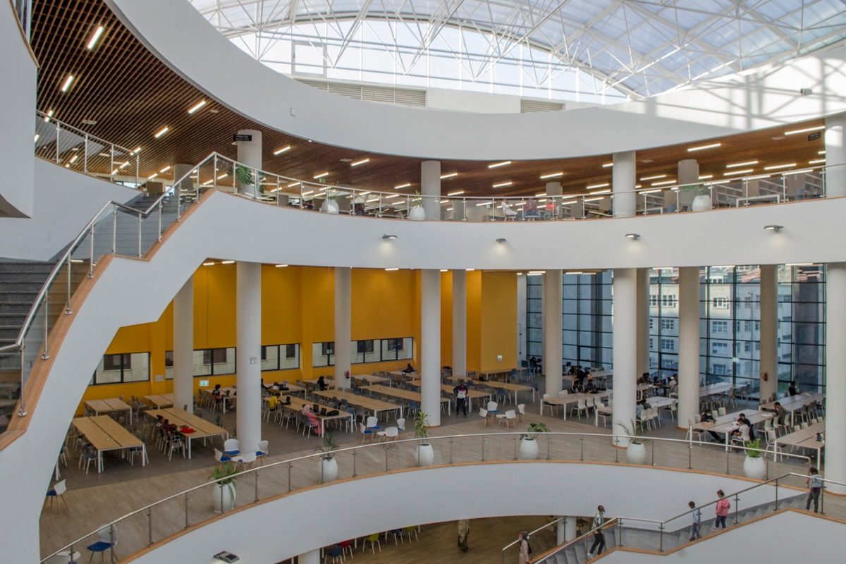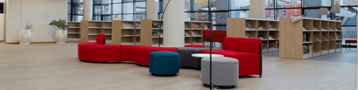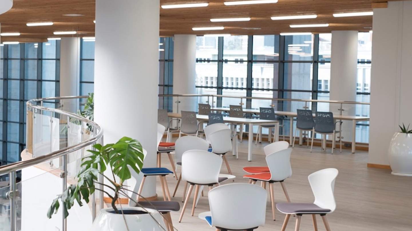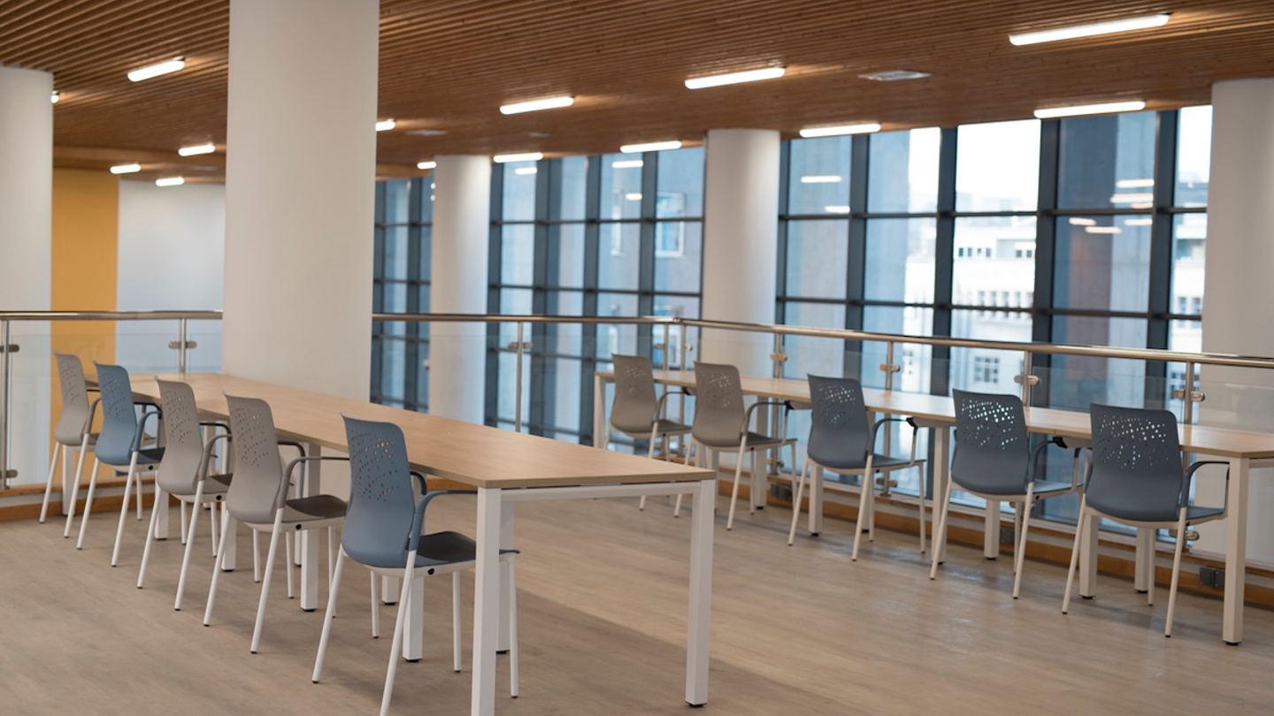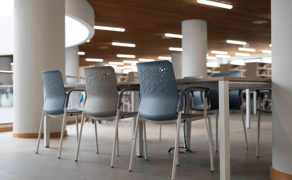Die oberen Stockwerke verfügen über große gemeinsame Lese- und Arbeitsbereiche, die mit langen Vital Pro-Tischen und Urban Block-Stühlen ausgestattet sind. In kleinen Ecken, die auf das zentrale Atrium blicken, werden die kleinen Bend-Beistelltische mit stapelbaren Whass-Stühlen kombiniert, die mit ihren Holzbeinen und der gepolsterten Sitzfläche für Komfort und Wärme sorgen, um den entspannten und intimen Charakter zu unterstreichen.