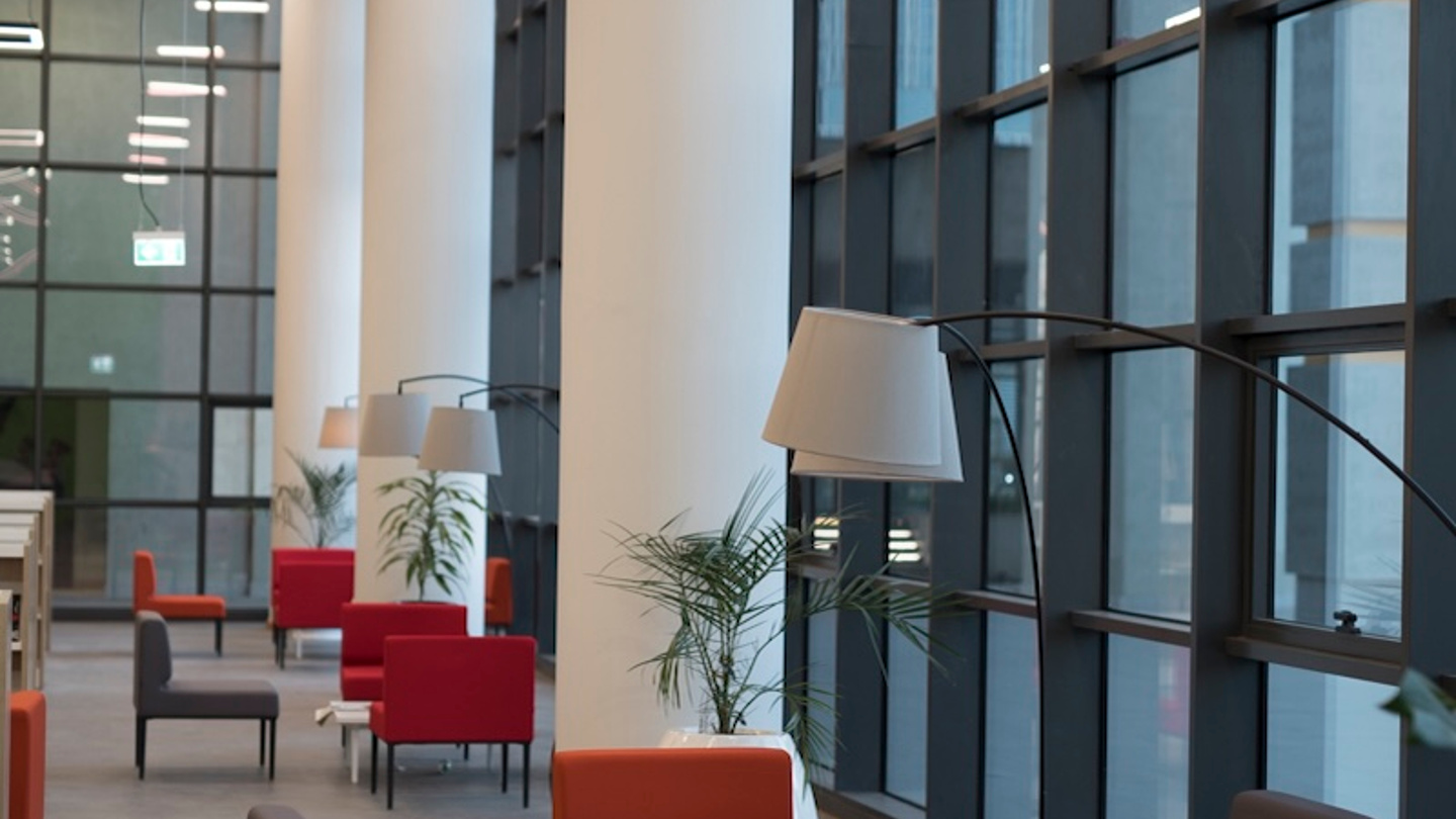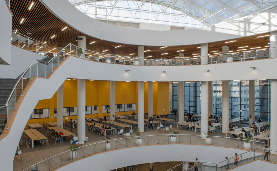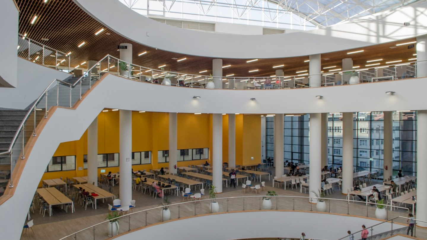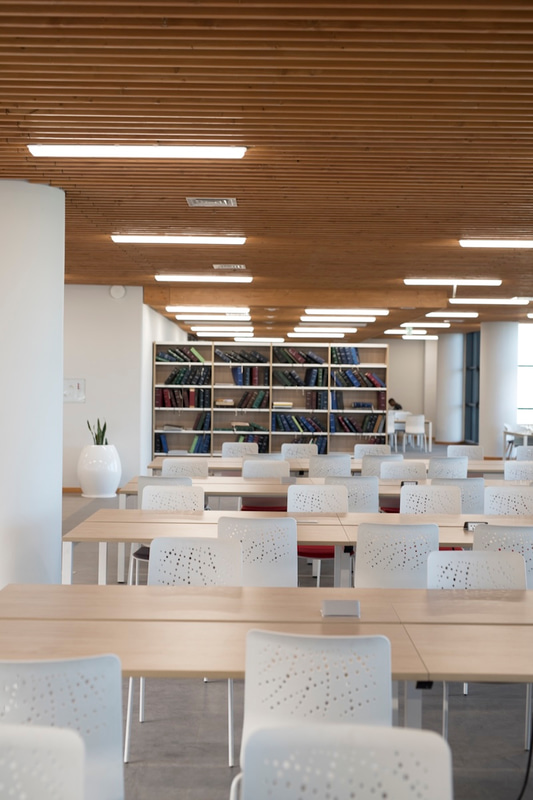 Die oberen Stockwerke verfügen über große gemeinsame Lese- und Arbeitsbereiche, die mit langen Vital Pro-Tischen und Urban Block-Stühlen ausgestattet sind. In kleinen Ecken, die auf das zentrale Atrium blicken, werden die kleinen Bend-Beistelltische mit stapelbaren Whass-Stühlen kombiniert, die mit ihren Holzbeinen und der gepolsterten Sitzfläche für Komfort und Wärme sorgen, um den entspannten und intimen Charakter zu unterstreichen.