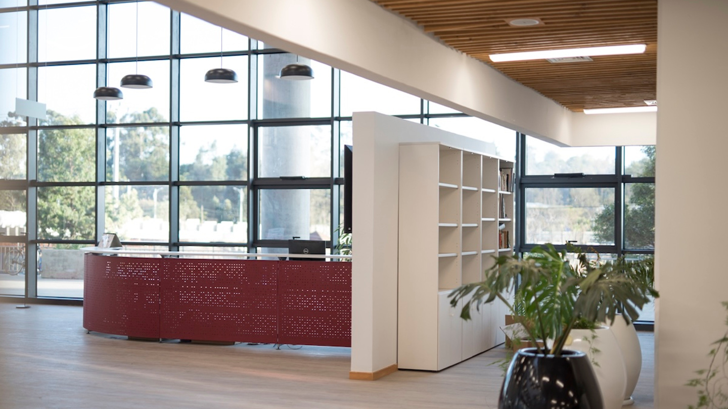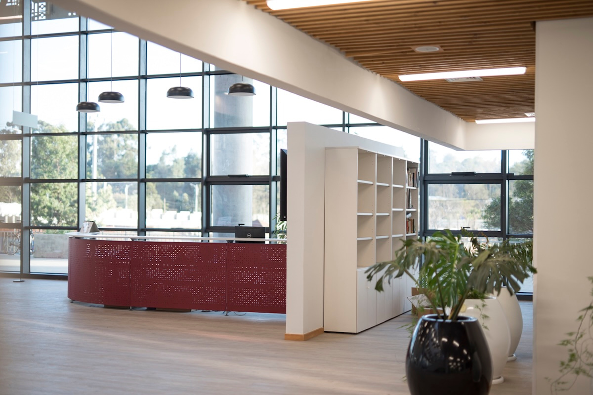 Die ausladende Informa-Empfangstheke unterstreicht, wie anpassungsfähig das gesamte Projekt ist und wie die Möbel im Raum fließen. Sie besteht aus mehreren Modulen, die komplett personalisierbar sind, und ihre burgunderfarbene Front verleiht ihr einen Hauch von Eleganz und passt sich in die Farbpalette der Bibliothek ein.