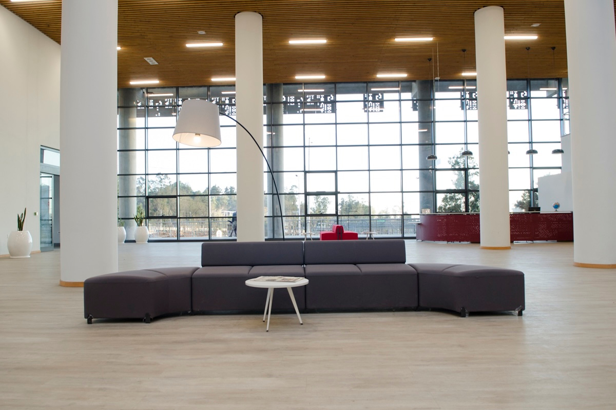 Wie ein öffentlicher Platz der Begegnung und des Wissens lädt der große offene Raum im unteren Stockwerk rund um den bepflanzten Bereich und die Bücherregale zum Lesen und zu Austausch und Beratung ein. Die organischen und dynamischen Bend-Module mit ihren Hockern und Beistelltischen in Kombination mit den Longo Nómada Sofas und Couchtischen schaffen ein entspanntes und dynamisches Umfeld, während die starke Farbgebung und flexiblen Konfigurationsmöglichkeiten das Lesen zu einem spielerischen und feierlichen Akt machen.
