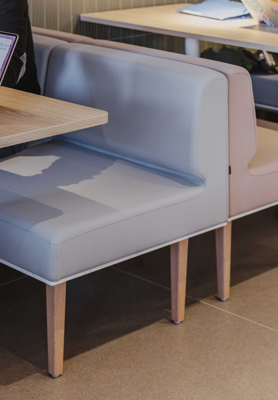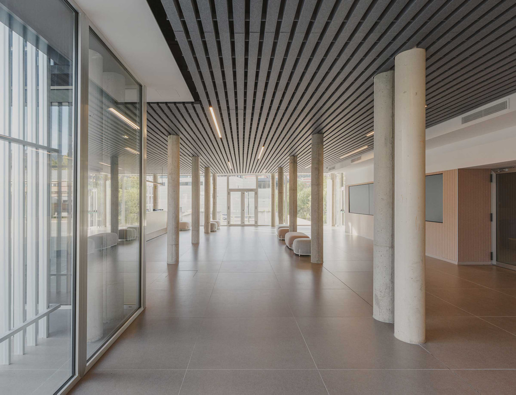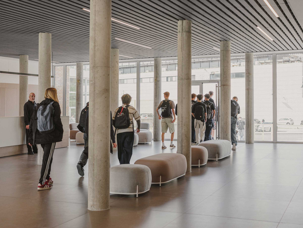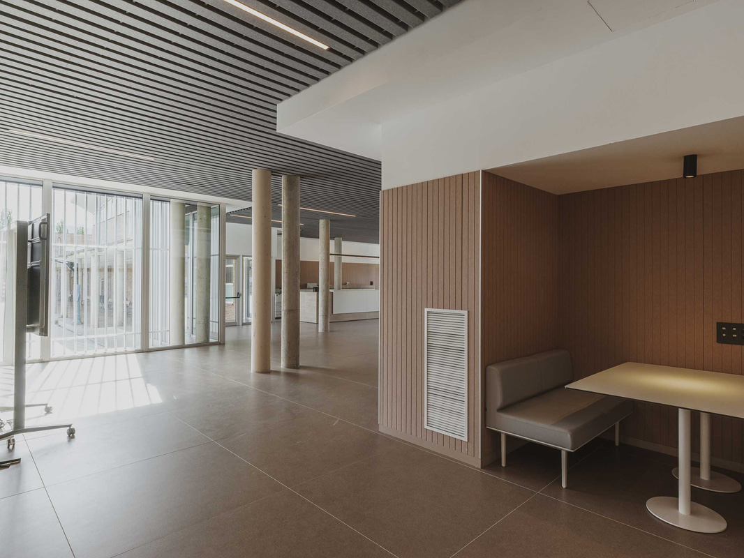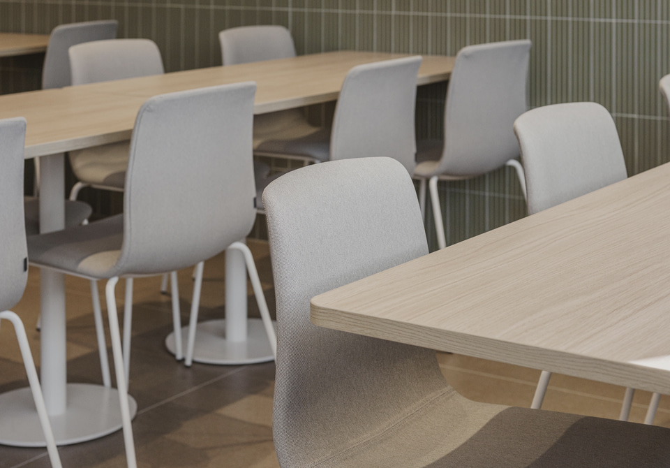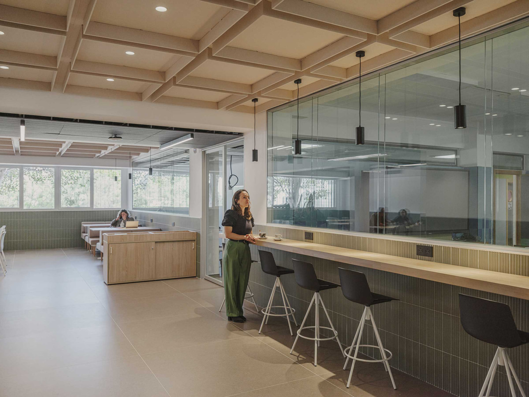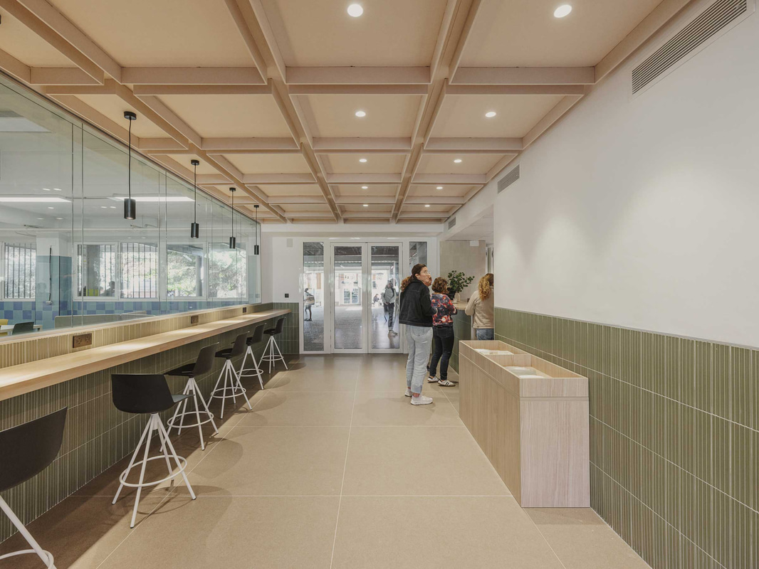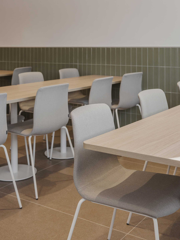 In der Lehrerkantine - einem von der Schülerschaft getrennten Raum, der jedoch durch eine gemeinsame Küche verbunden ist, die wie ein gemeinsames Herz schlägt - passt sich das Mobiliar den Bewegungen des täglichen Lebens an, während schallabsorbierende Decken und Keramikplatten den Lärm reduzieren und das Wohlbefinden fördern.