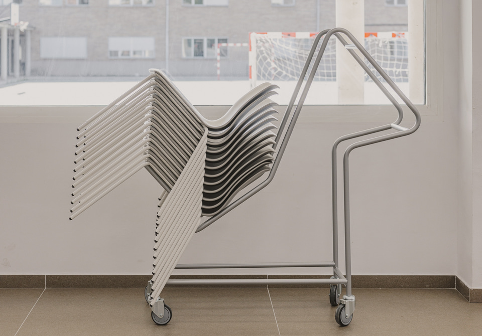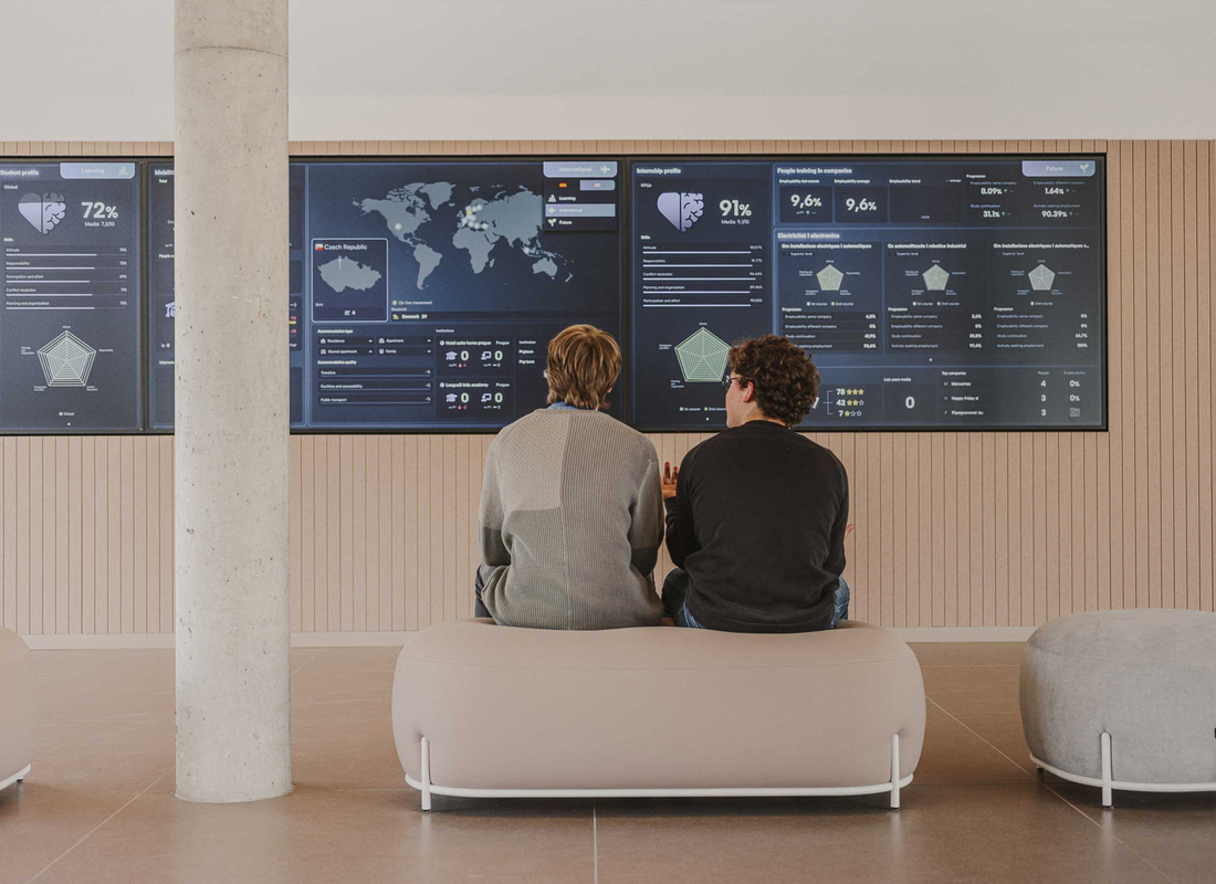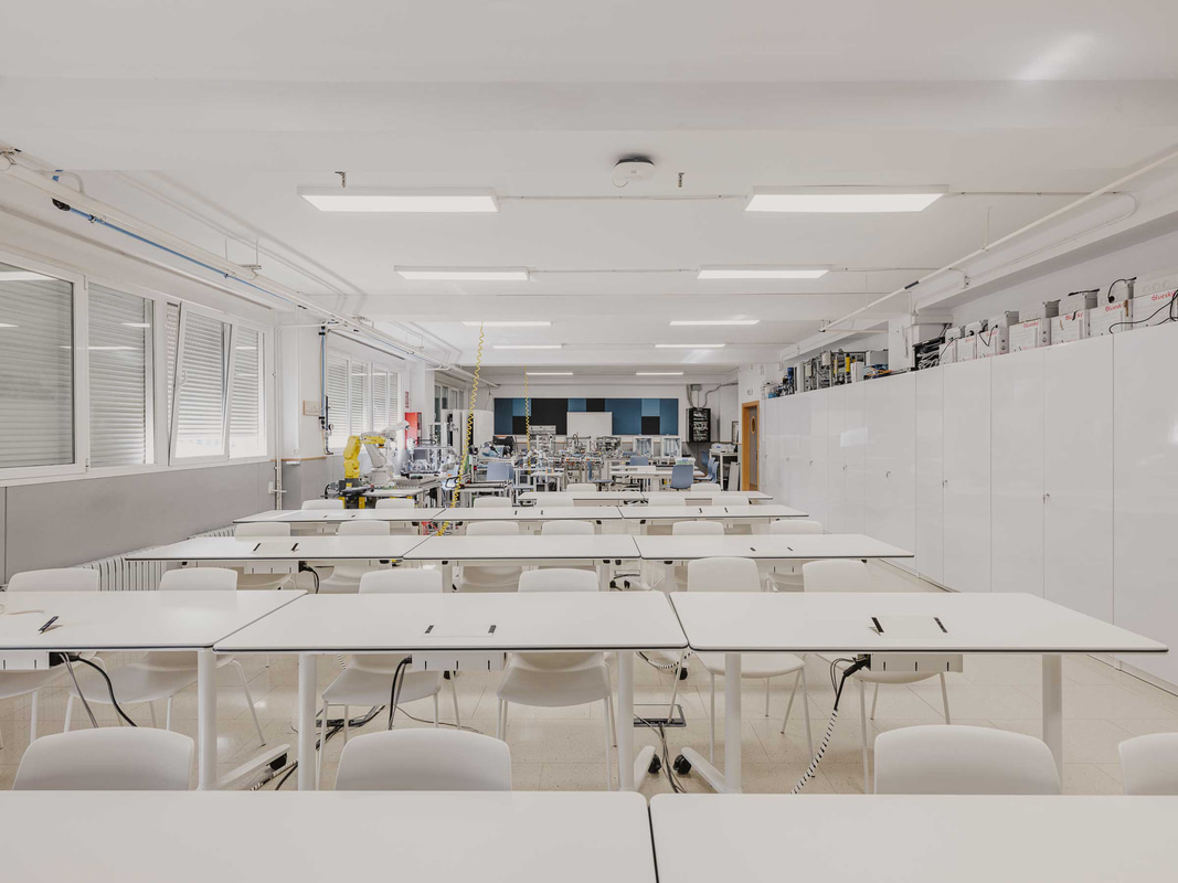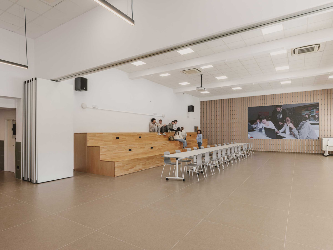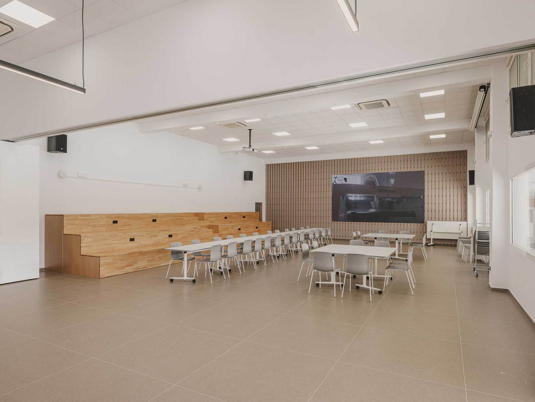 In der Studentenlounge wird die Flexibilität auf eine andere Ebene gehoben: leichte, mobile Tische, Klappstühle, dynamische Tribünen und eine große Projektionsfläche ermöglichen es, den Raum in Sekundenschnelle von einer Roboterwerkstatt in einen Ausstellungsbereich oder einen Raum zu verwandeln, in dem man an einem regnerischen Tag einfach nur Karten spielen kann.