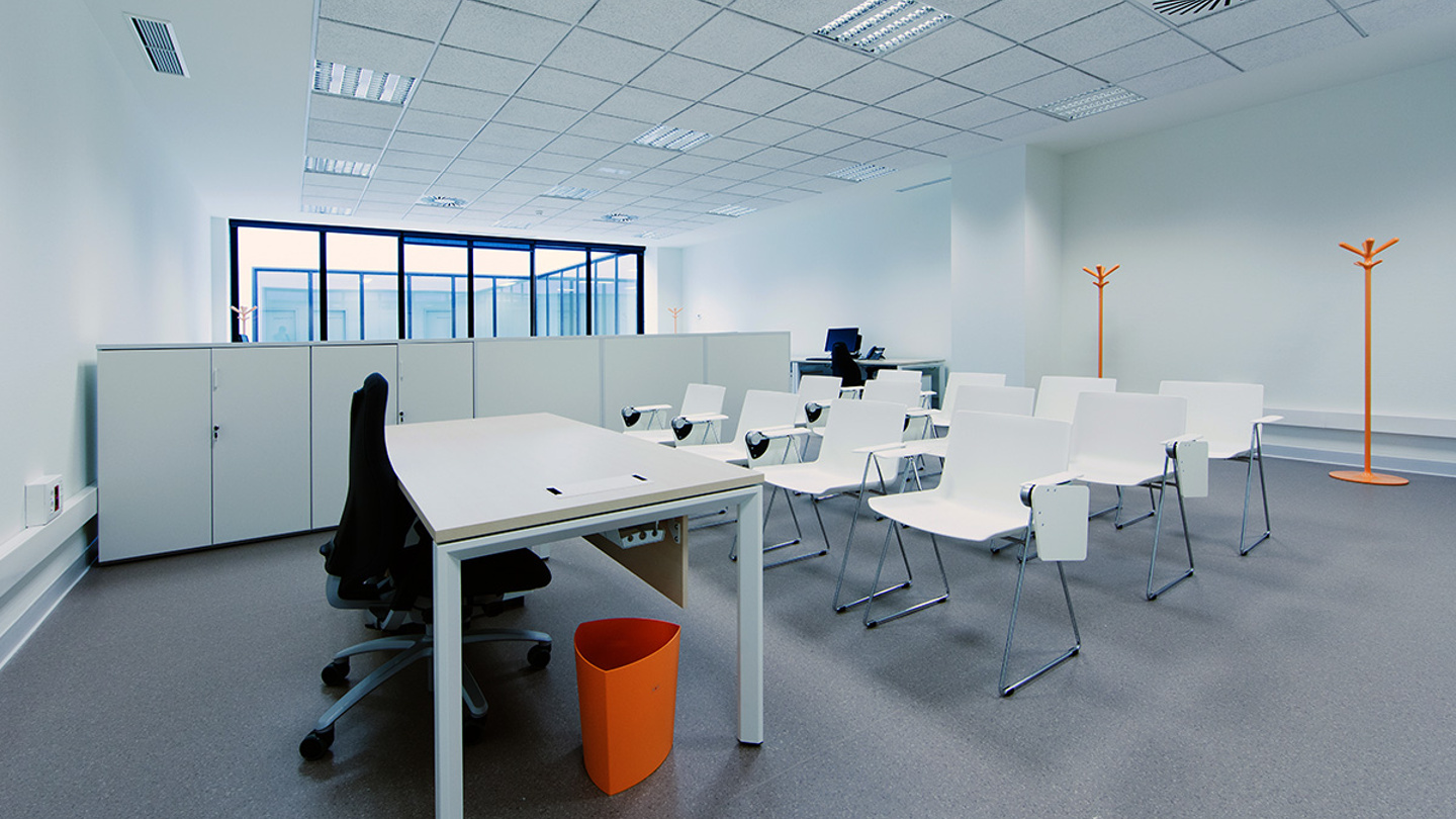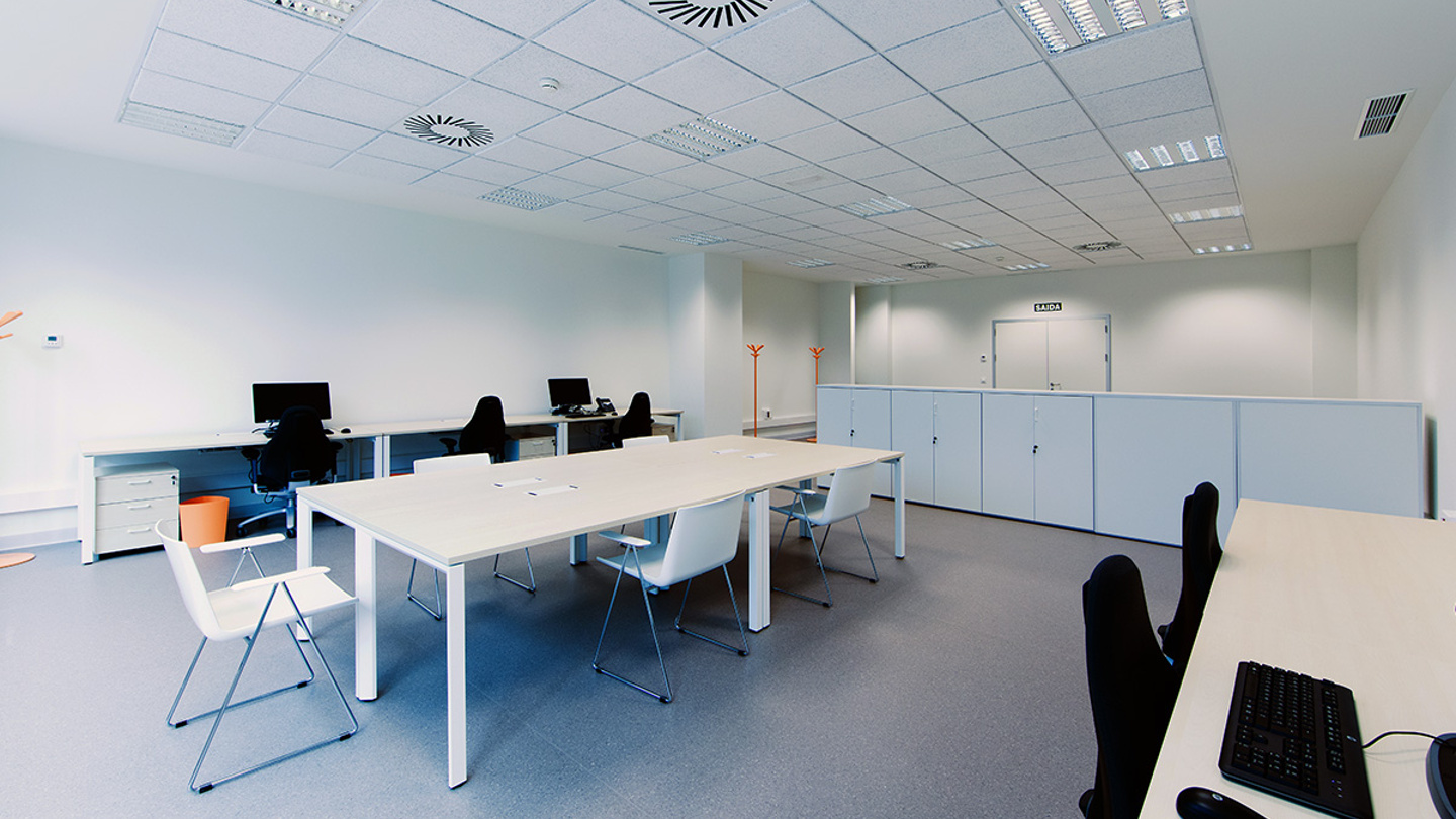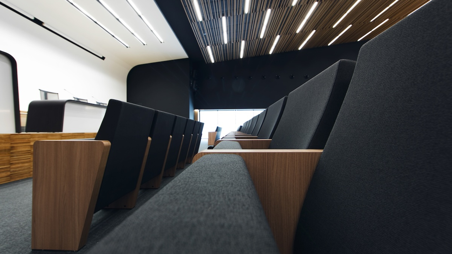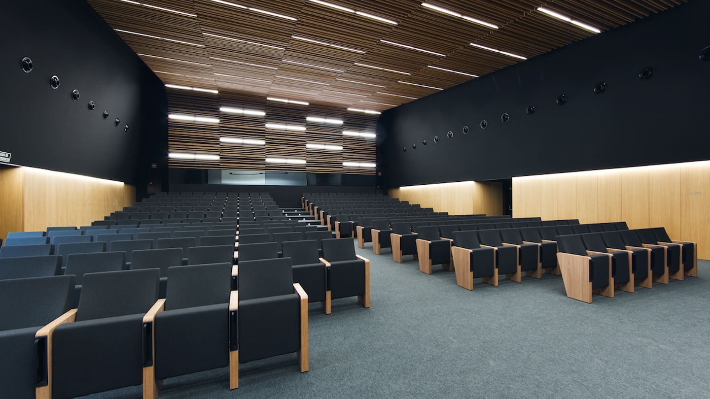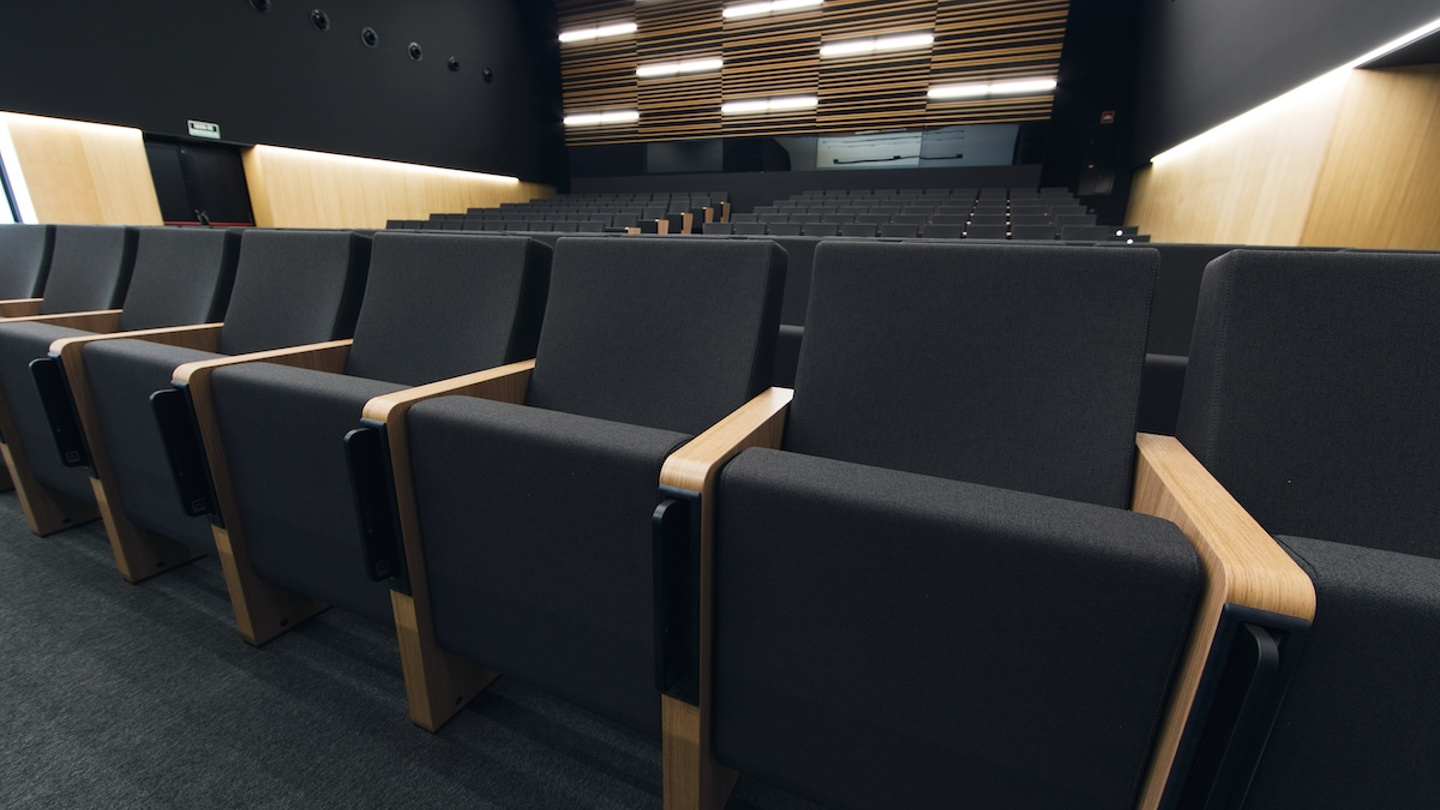 Die ergonomischen, klappbaren Audit-Sessel im Auditorium, die stabiles Sitzen und Erholung gewährleisten, sowie die Tabula-Tische und Wing-Stühle in der Cafeteria sind ebenfalls Teil des Beitrags von Actiu zu diesem Projekt, das auf das Wohlbefinden der Menschen ausgerichtet ist.