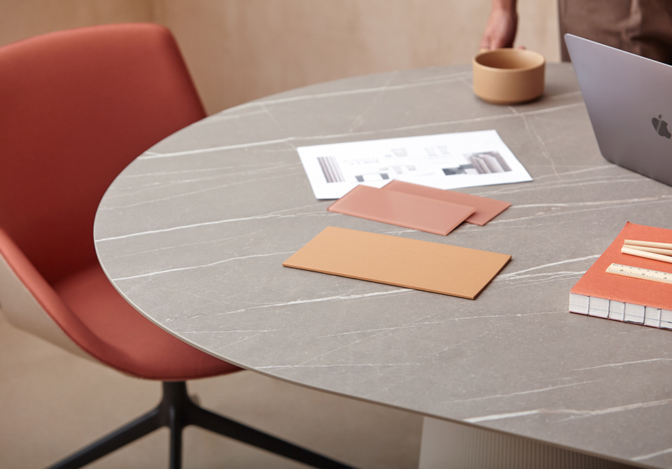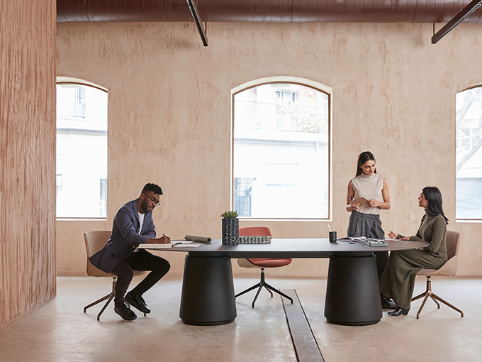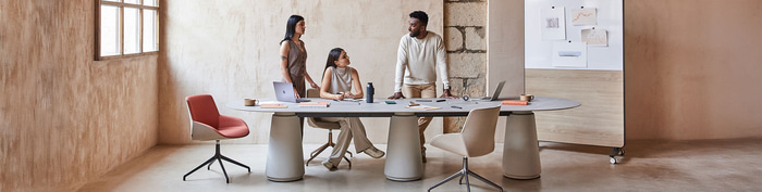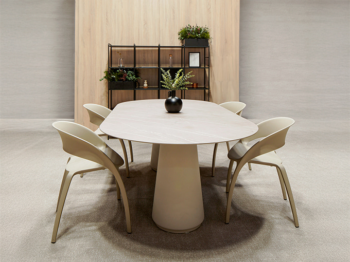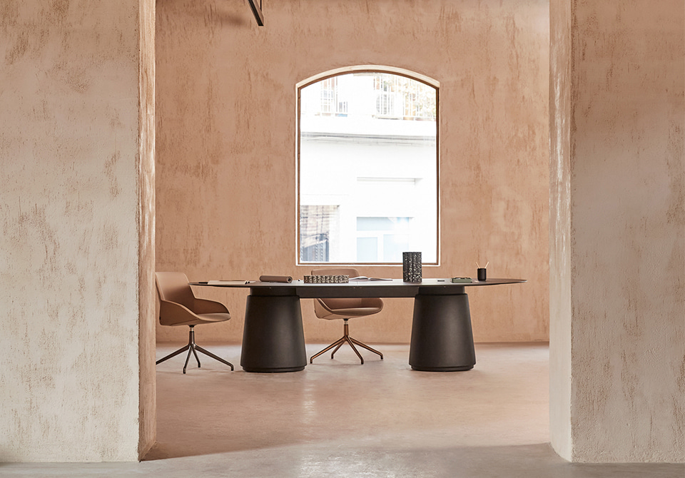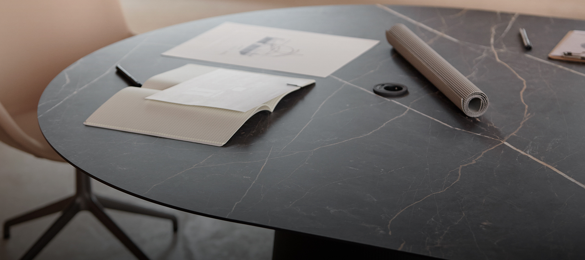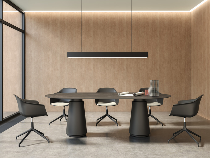 Dorik-Tische können eine oder mehrere Säulen zu größeren Besprechungstischen kombinieren, wobei die strukturelle Steifigkeit und Eleganz erhalten bleibt, oder zu kleineren Tischen für engere Besprechungen oder Einzelarbeitsplätze.
