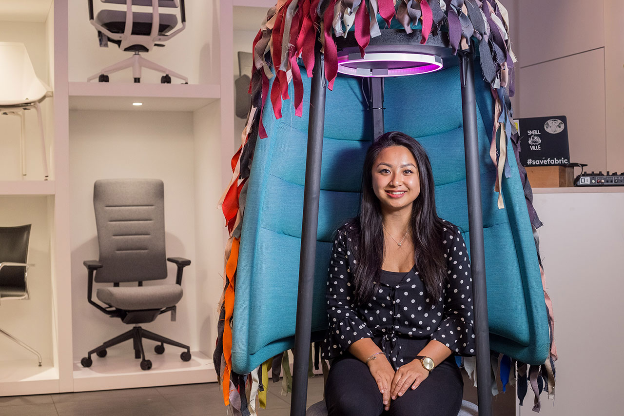 With her ‘Wigzie’ project, Mandy Cheunginverted the Badminton armchair and employed various Gabriel fabrics as a homage to people suffering from cancer, recreating different hairstyles and covering this piece of furniture with multiple colours.