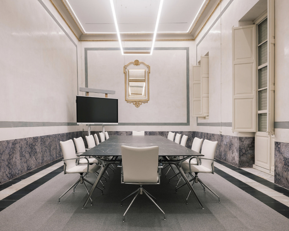 The rector's room, the most representative area of the building, has an Arkitek table, designed by Alegre Design in collaboration with Cosentino, and Cron chairs upholstered in cream. A space that combines functionality and aesthetics, framed by original stuccoes that reinforce its institutional character.