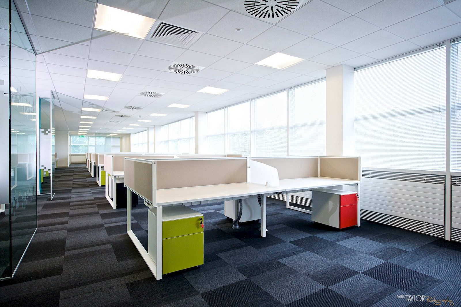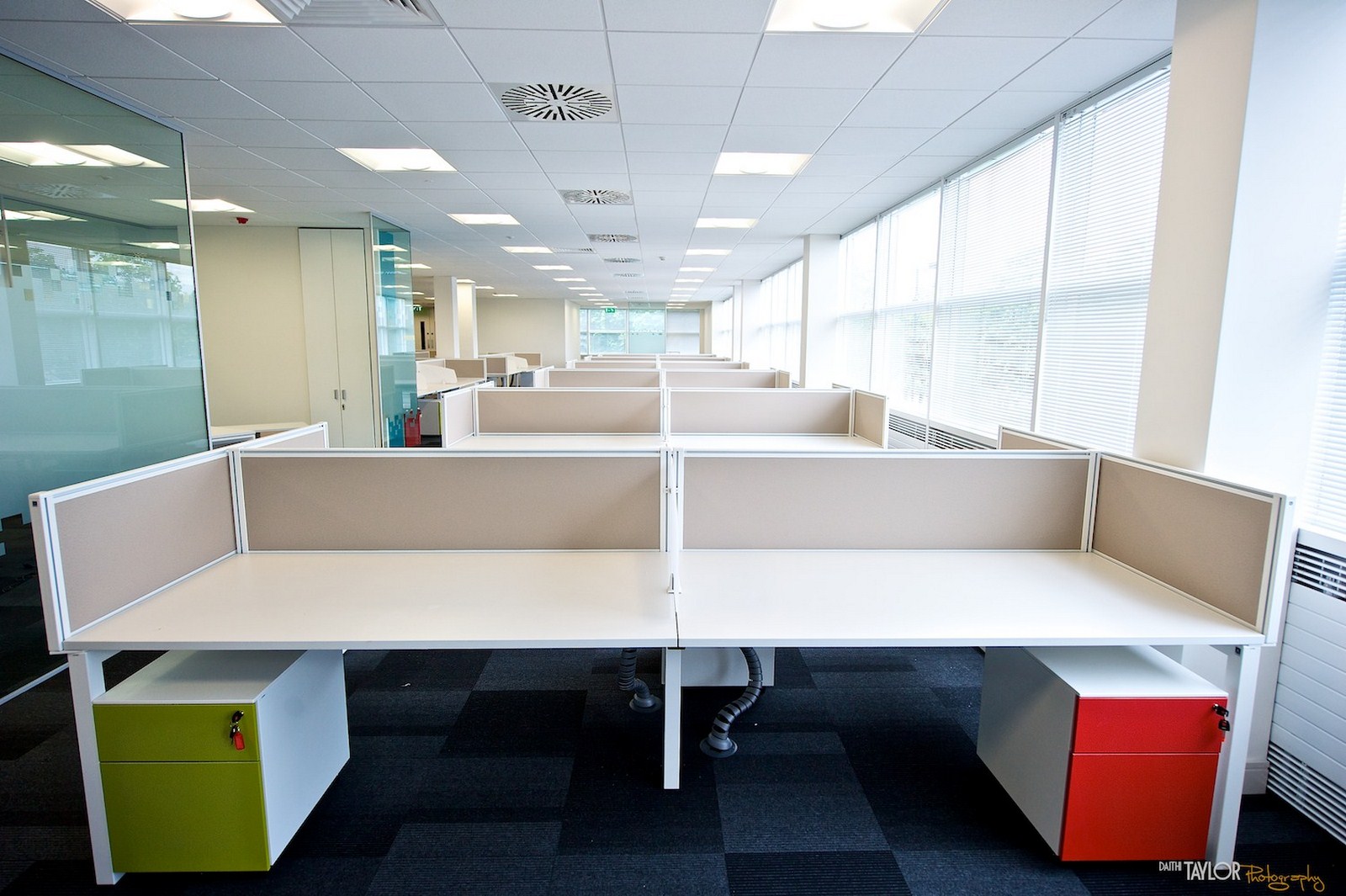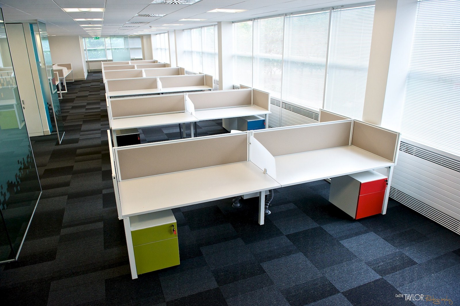 The installation was completed with a touch of colour. The tabletop dividers have been upholstered in an elegant beige colour, and at the same time, in each work area, metal pedestals combined in cheerful tones such as pistachio green, electric blue and red have been placed.