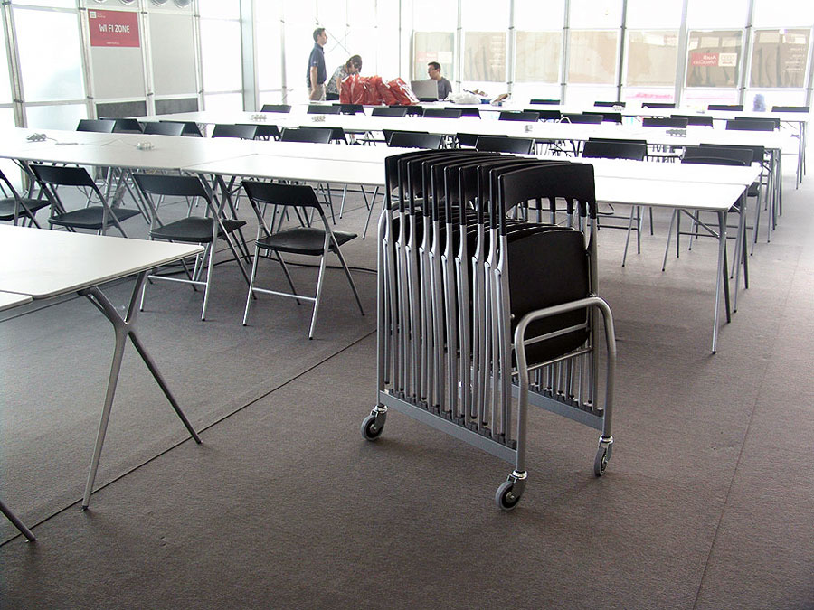 The Plek program is complemented with trolleys which enable easy storage and transport for both the desks as well as the chairs. The combination of desks and folding chairs enable the creation of highly functional and aesthetic features, capable of integrating themselves into the most diverse environments.