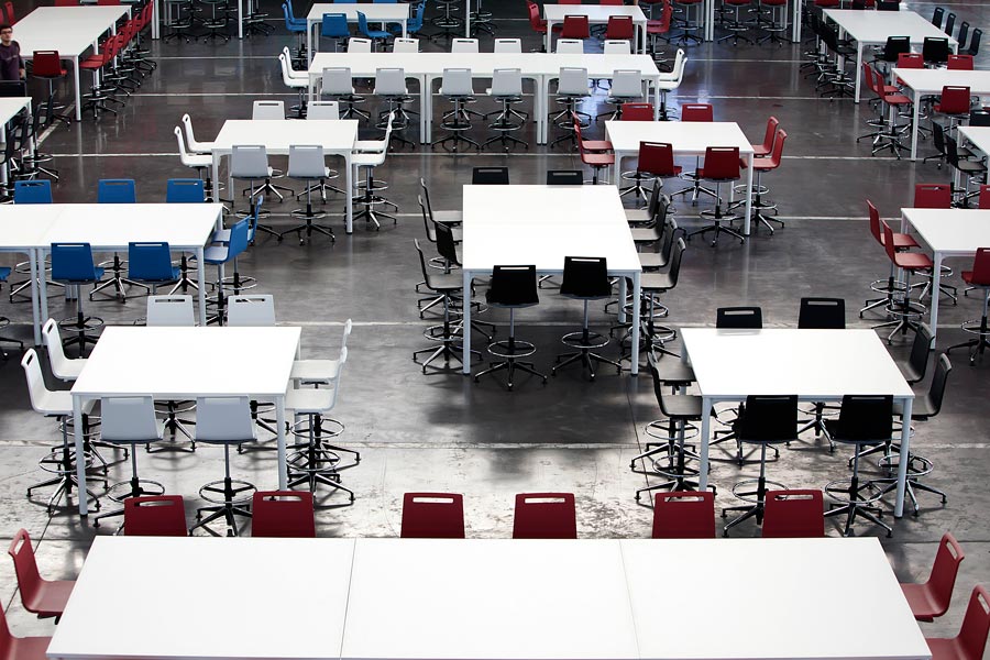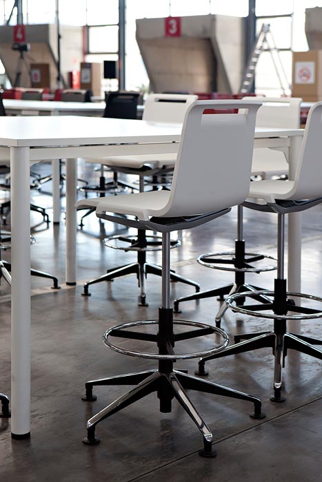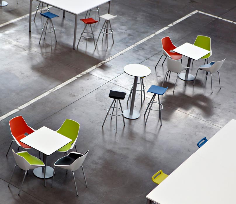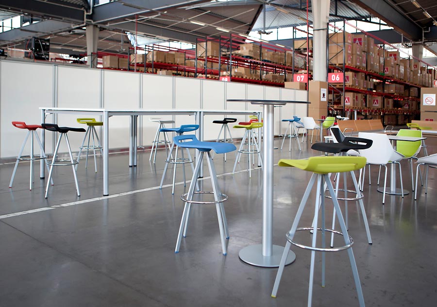 A area destined to be the cafe, informal and casual, was the first of the three spaces and was in charge of welcoming the attendees to the event. Here we placed Cafe tables in the different heights available. (73 and 100 cm). The models of the square table were combined with the Viva chair, while the round, higher ones, were paired with the other versions of Mit, the banquet.