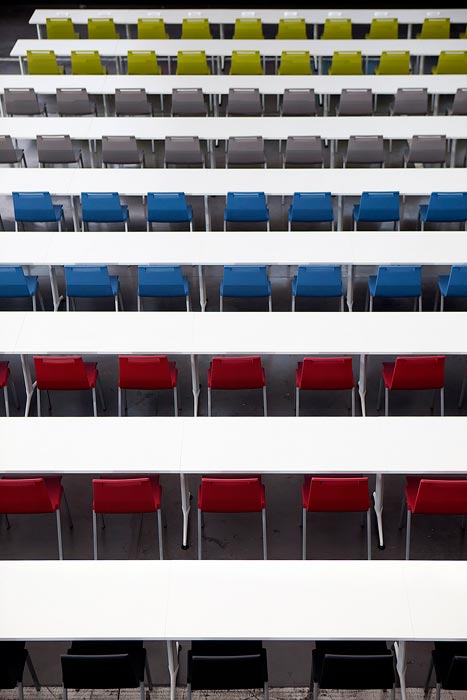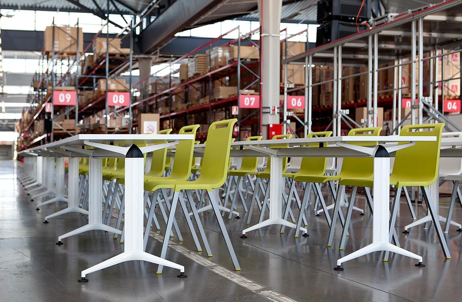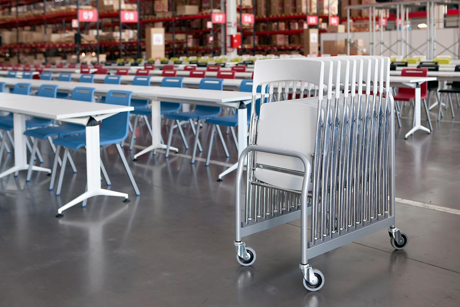 On the sides we have placed trolleys designed to store and transport the Plek folding chairs in a simple and comfortable way. Ten chairs can fit into each trolley which were used as extra seating.