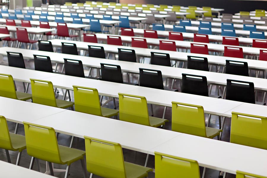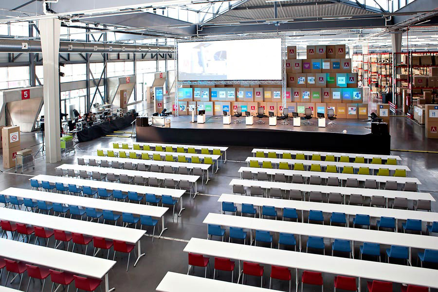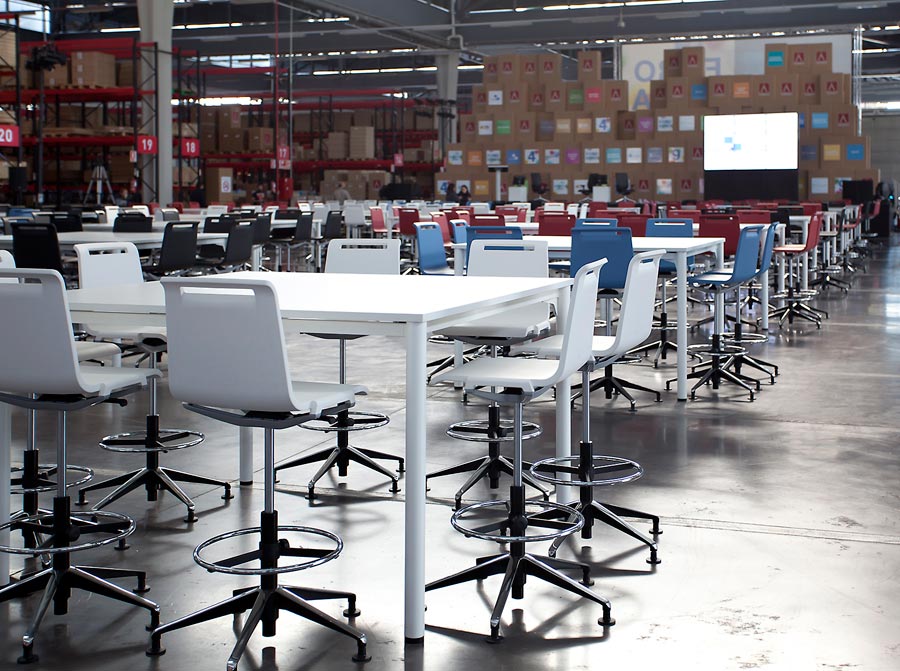 On the opposite side of the stage for speakers, a work and networking area was set up. Different compositions from the Cool E100 program of desks covered a wide space, which was turned into meetings for eight, twelve or sixteen participants.