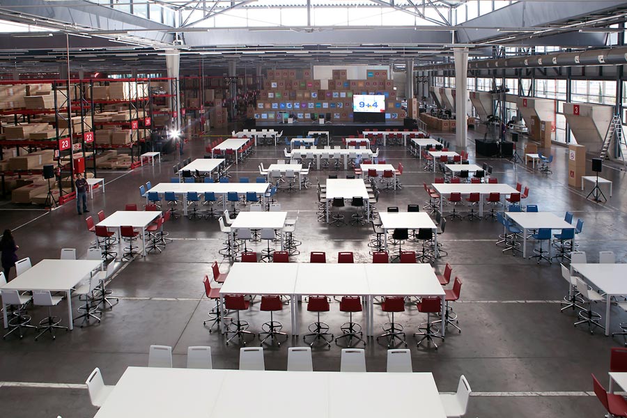 The event required a daring project, with great creativity, which resulted in the construction of three spaces limited by cardboard boxes that have marked the line. A two sided central stage, divided the conference area from the work area.
