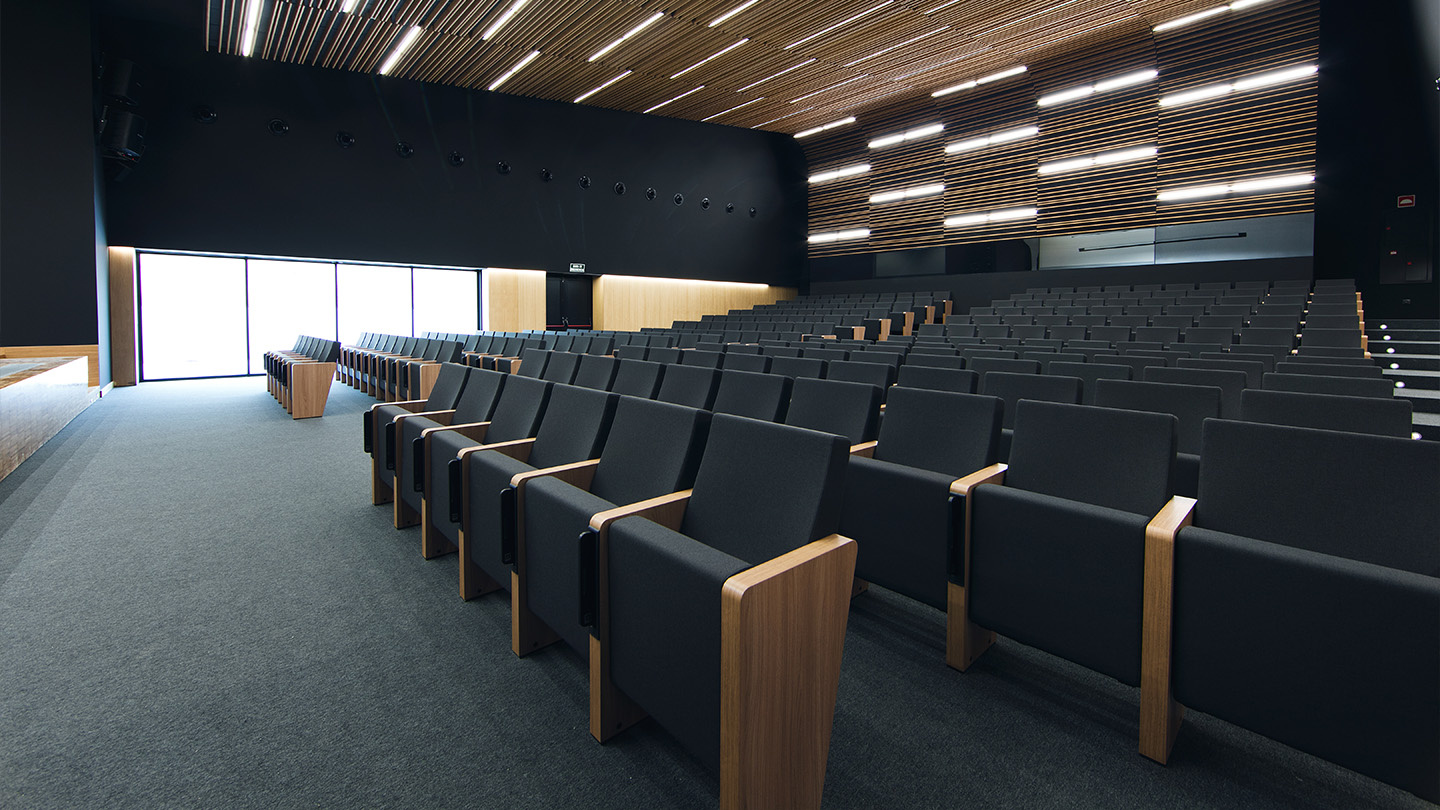 The Audit armchairs in the auditorium, with ergonomic volumes that ensure stable recovery when folded, and the Tabula tables and Wing chairs in the cafeteria, are other of the programmes with which Actiu has participated in this project, focused on people's well-being and which articulates content and container in a natural and highly functional manner.