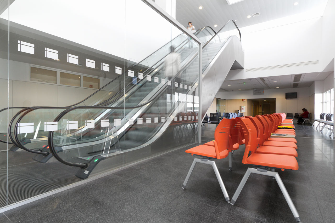 The five floors that make up the building mass are broken up by courtyards and openings in the facades, which are consciously designed to capture constant natural light, the ability to enjoy the views which the surroundings offer and the best natural ventilation. The Spacio bench covers the open plan waiting areas. They are manufactured in polypropylene and fibreglass and can be chosen from a range of colours.