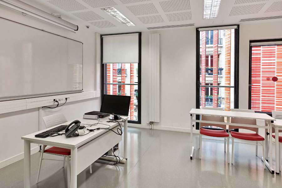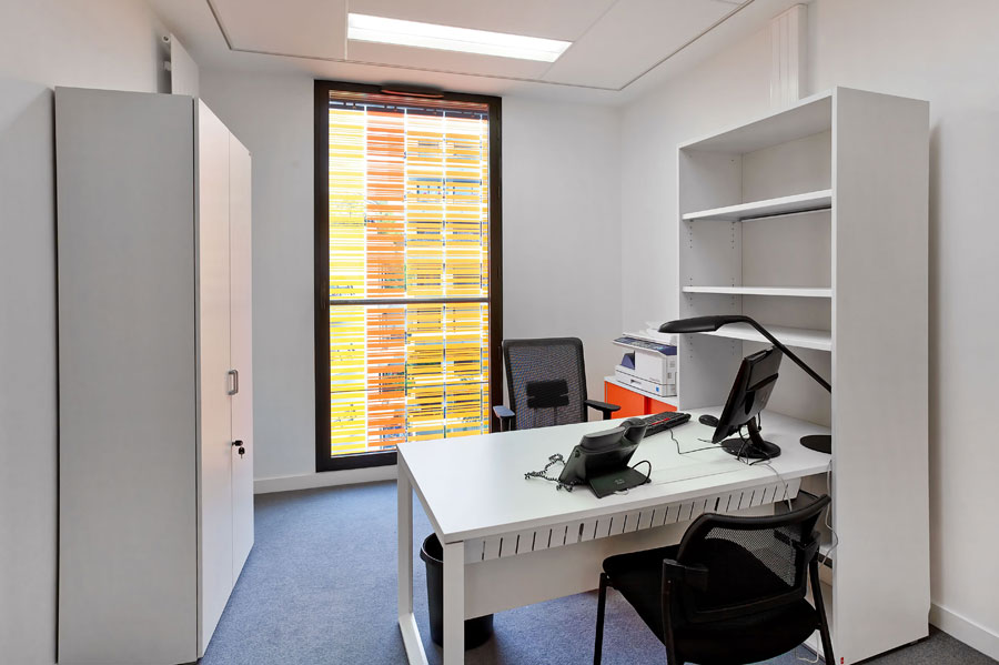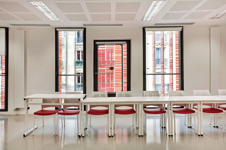 he Novancia school in Paris is the new Chamber of Commerce and Industrial business school; which reflects its origins and represents at the same time innovation. This new building is derived from the fusion of the two original schools (Advancia y Negocia) in a single establishment, in 2011. In contrast to the brick which was used in the original building opened in 1908, the new glass facade of the extension brings a gradient of colour from red to yellow with more that 4000 rotating slats which controls the inlet of temperature and light into the building.