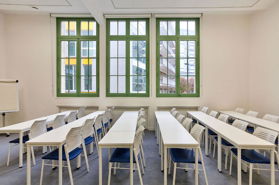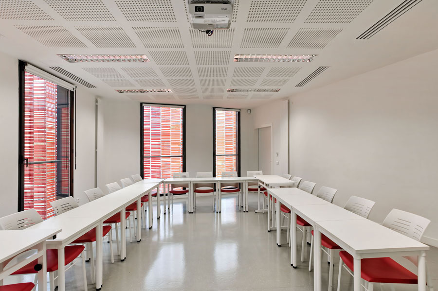 For the multi purpose rooms the same composition was chosen as the classrooms (Dynamic desks and Spacio chairs) although to differentiate between the rooms, in this case the seats of the chairs have been upholstered in red.