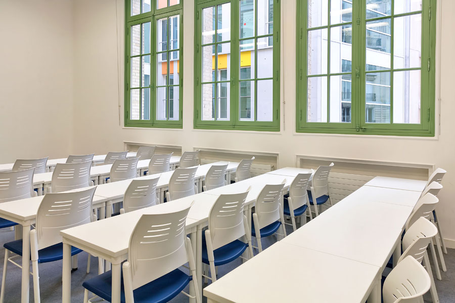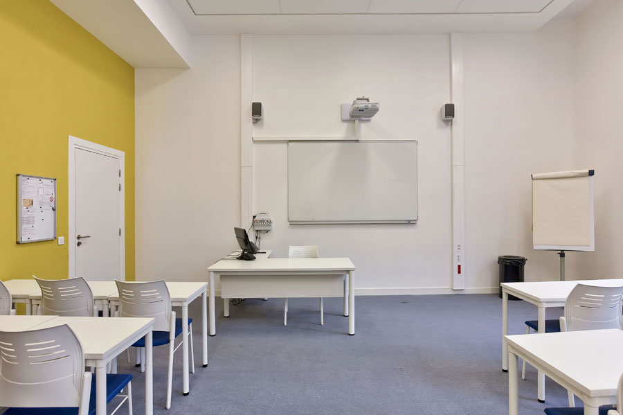 The classrooms have been furnished with desks from the Dynamic program, simple lines but which allow you to tailor solutions. The chairs belong to the Spacio models, with backs made from polyproplylene and fibre glass in white, to match the desks and an upholstered seat in electric blue.