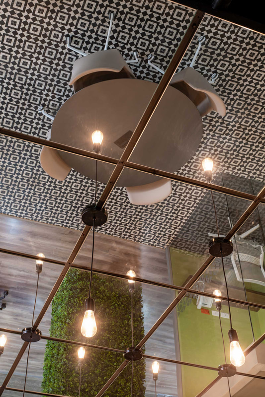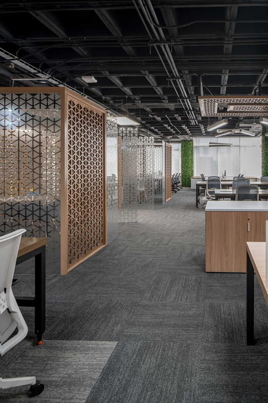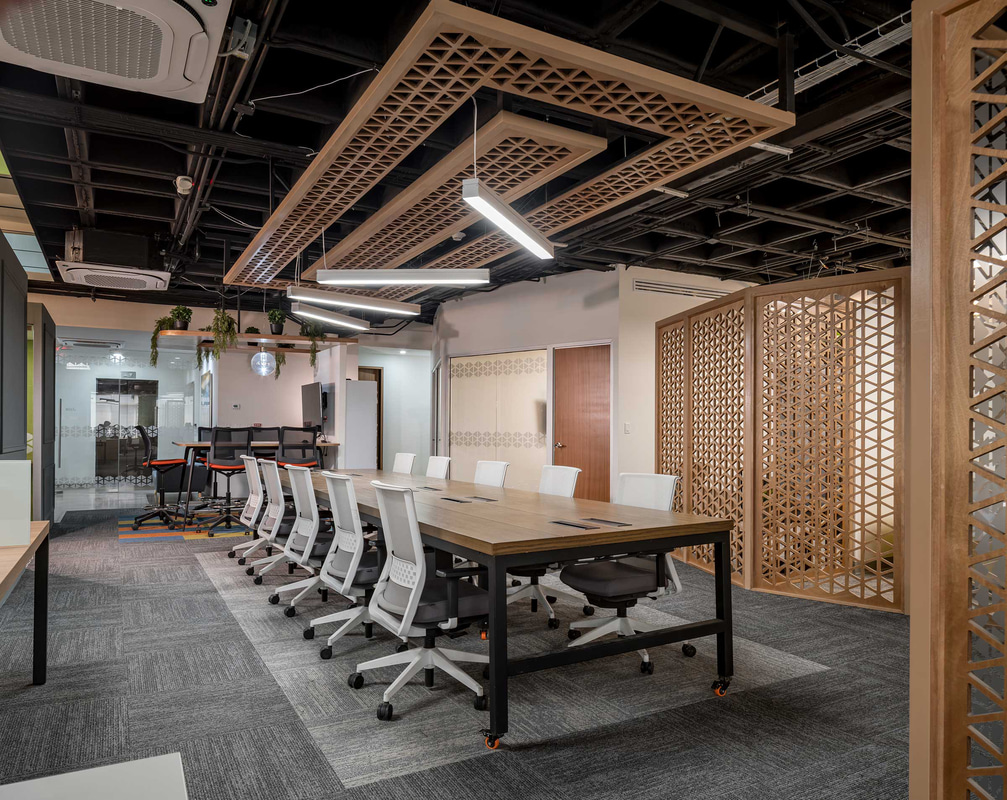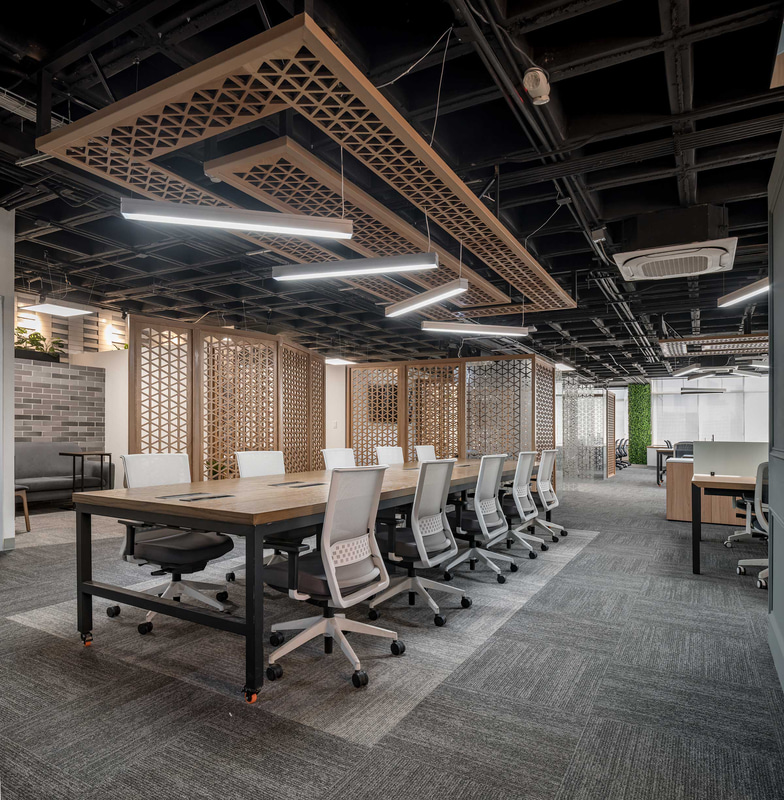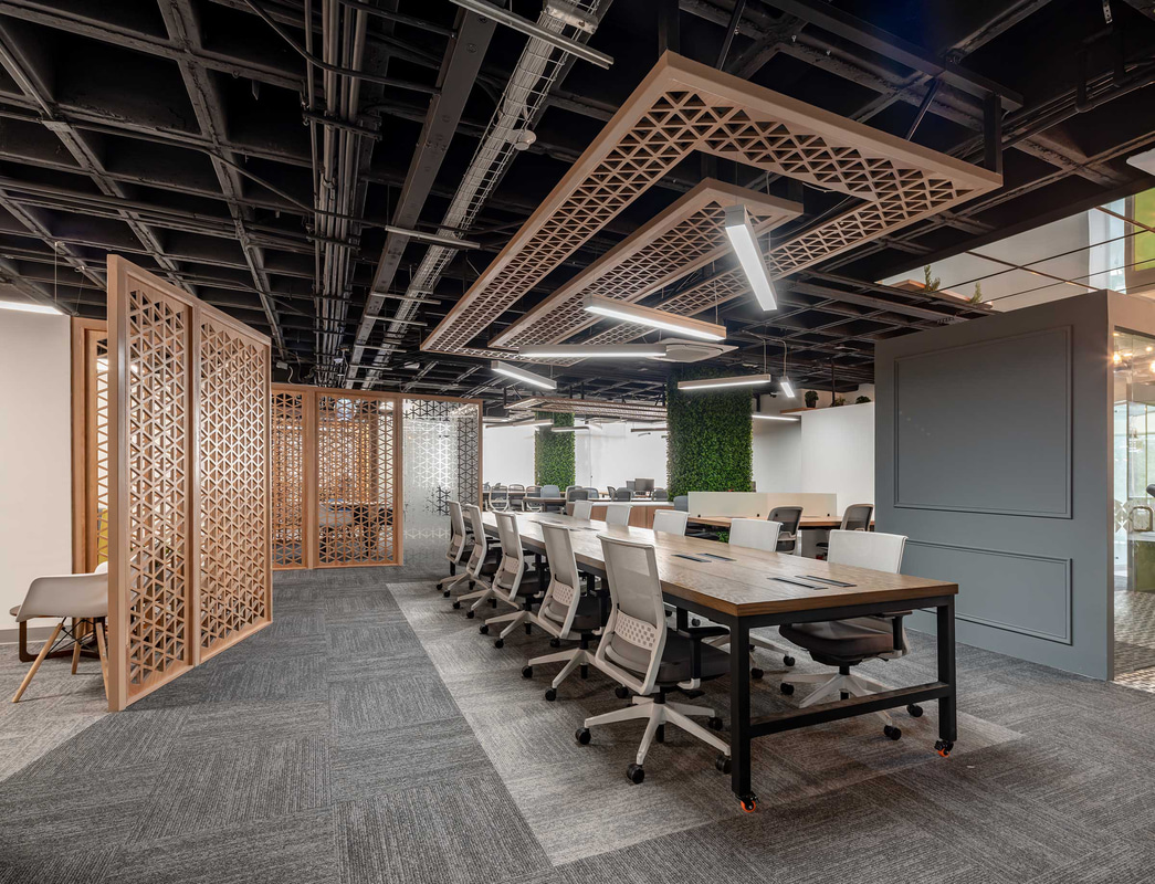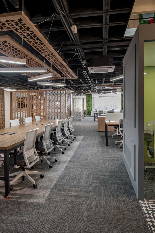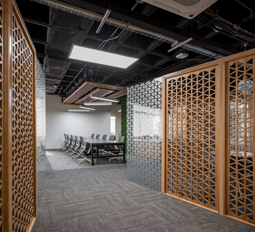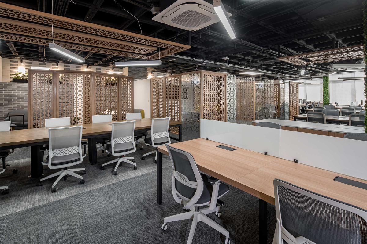 Fundamental in this type of open-plan space, acoustic comfort is enhanced through the use of absorbent materials such as wood, materialised in a lattice that also operates as a decorative element and hallmark of the project; upholstery or rugs.
