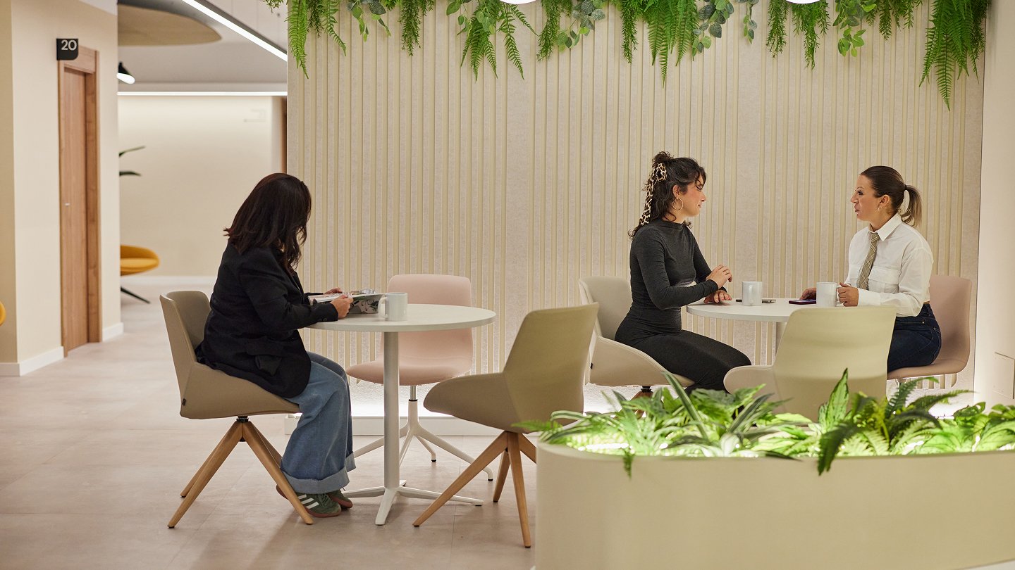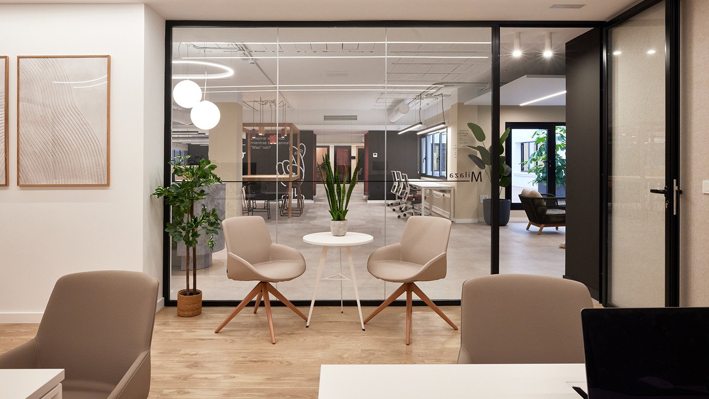 "I chose Actiu's furniture because of its guaranteed ergonomics and repositionability, and because of the composition of colours that its upholstery allowed, which is organic and fits in with the warm beige paint of the premises", adds the interior designer María Andes. The upholstery was chosen in a toasted tone, not too light so that it can withstand dirt, and the darkest colour is a fairly soft cauldron. In the large coworking room, the white of the tables enhances the reflection of light and luminosity, and oak is used in the offices. Biophilia is also present, through the landscaped courtyard at the entrance and artificial plants that integrate greenery in all the spaces.