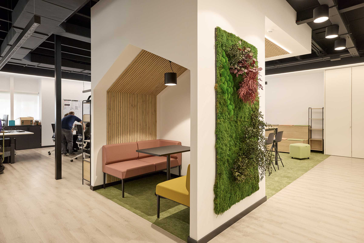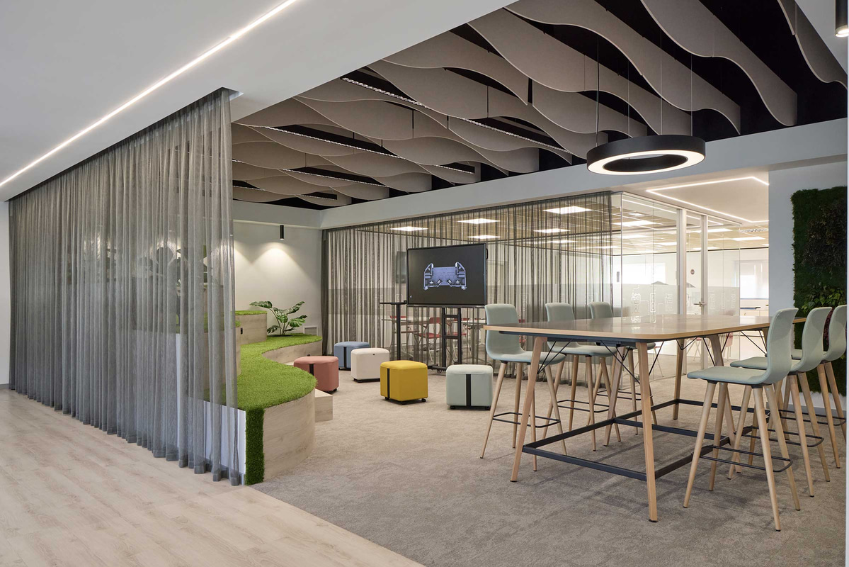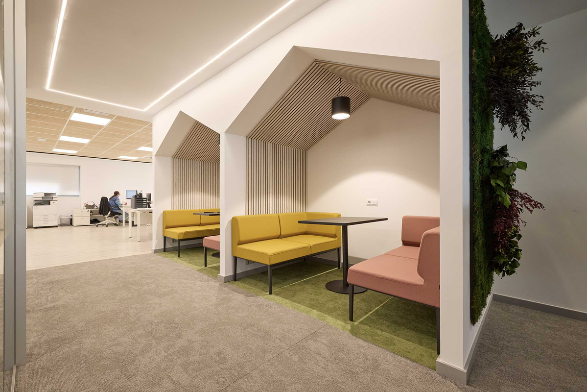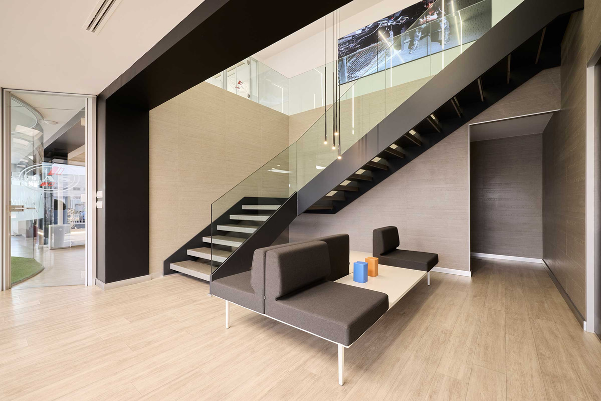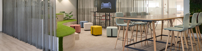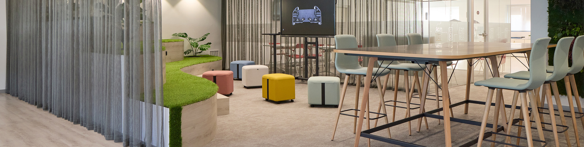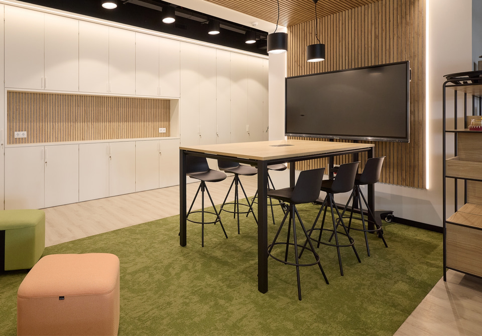 To dress up the new environment, Oficines chose Actiu programmes that combine durability and cutting-edge design, while guaranteeing global aesthetic coherence and the highest certificates of sustainability and industrial quality. Workstations equipped with the Mobility lift-up desks, which make it possible to alternate between sitting and standing, together with the TNK500 chair, a benchmark in lumbar support and synchro technology; meeting and break areas for a more comfortable working environment.meeting and break areas for quick interaction, with Twist high tables and Noom stools; and relaxation and reception areas, where Longo armchairs and Urban chairs add a sophisticated and very welcoming touch.