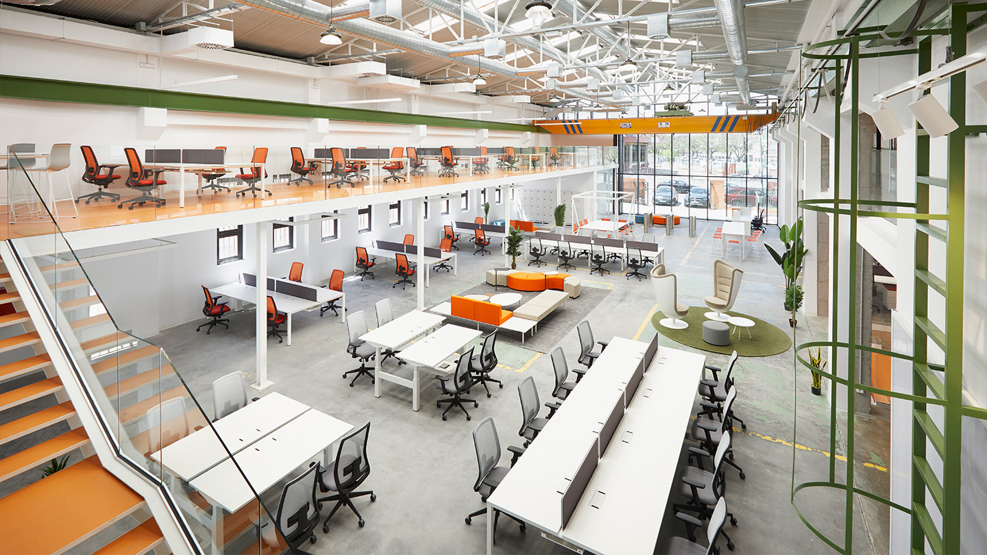 To execute this project, Digispace contacted the Carlos Manzano Arquitectos studio with a very clear objective: to convert the former headquarters where Bombardier manufactured and repaired train fronts in Alcobendas, Madrid, into a collaborative workspace.