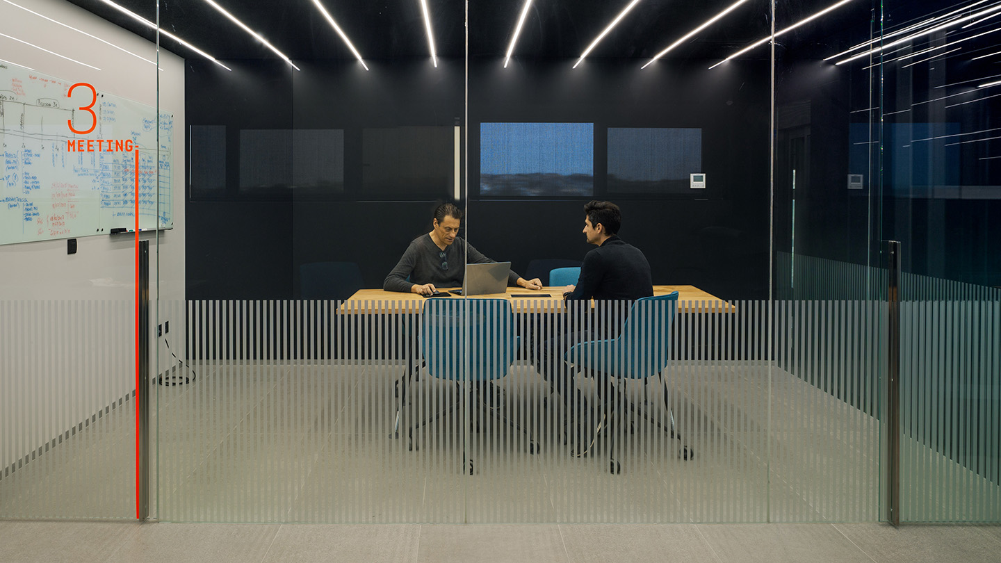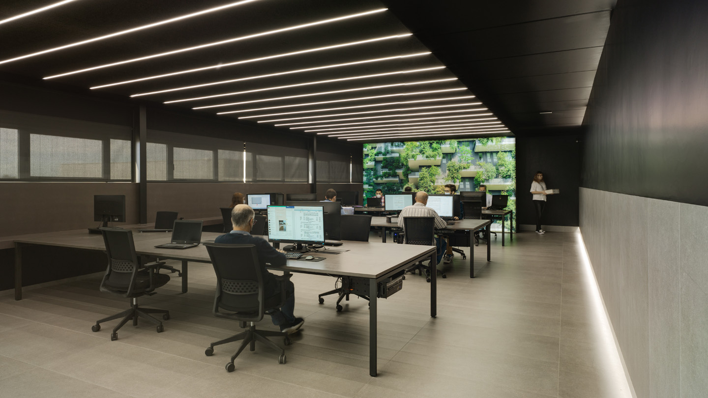 The anodyne character of the industrial estate where the offices are located led the architects to opt for a design that is closed to its surroundings, alternating open, fluid and comfortable spaces - acoustically, thermally and luminously - with others reserved for meetings or tasks requiring greater privacy. Three floors connected by the main vertical communication core of the old offices, which abandons its character of heavy infrastructure and reinvents itself as a 'large piece of furniture' for access.