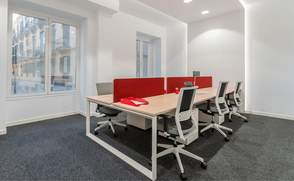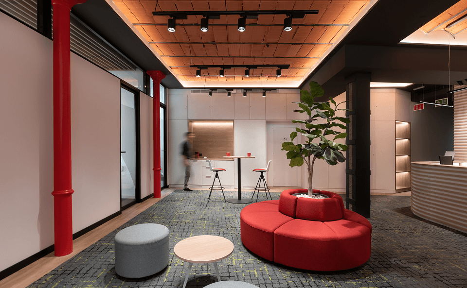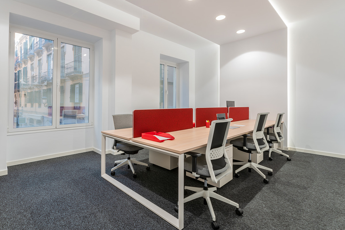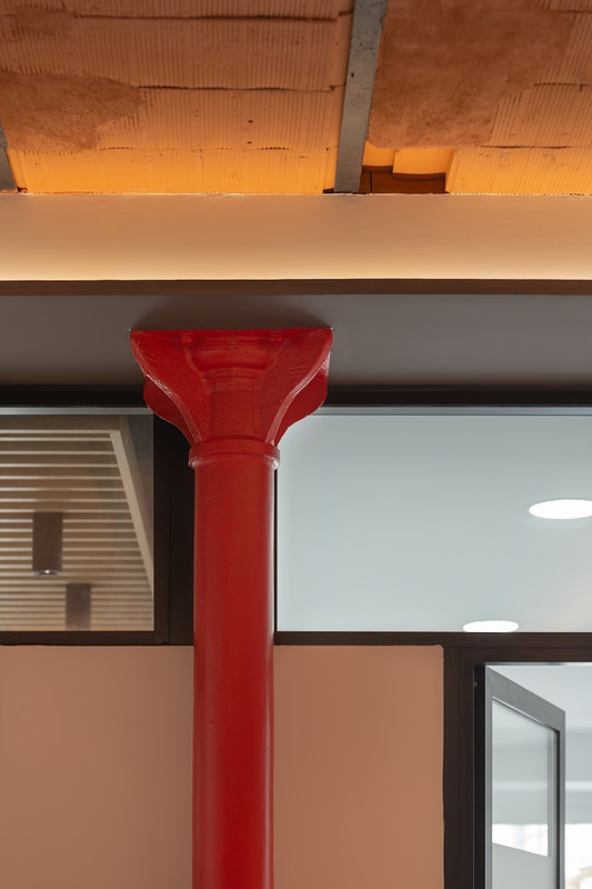 The protagonist of the project, the central square reproduces the spaces where, in a city like Malaga, most of the social and personal relationships take place. The textures and vegetation typical of a square are combined with a carpet that resembles cobblestones and improves acoustic comfort, while indirect lighting adds spaciousness and original cast iron columns painted in corporate red recall the typical Andalusian courtyard.