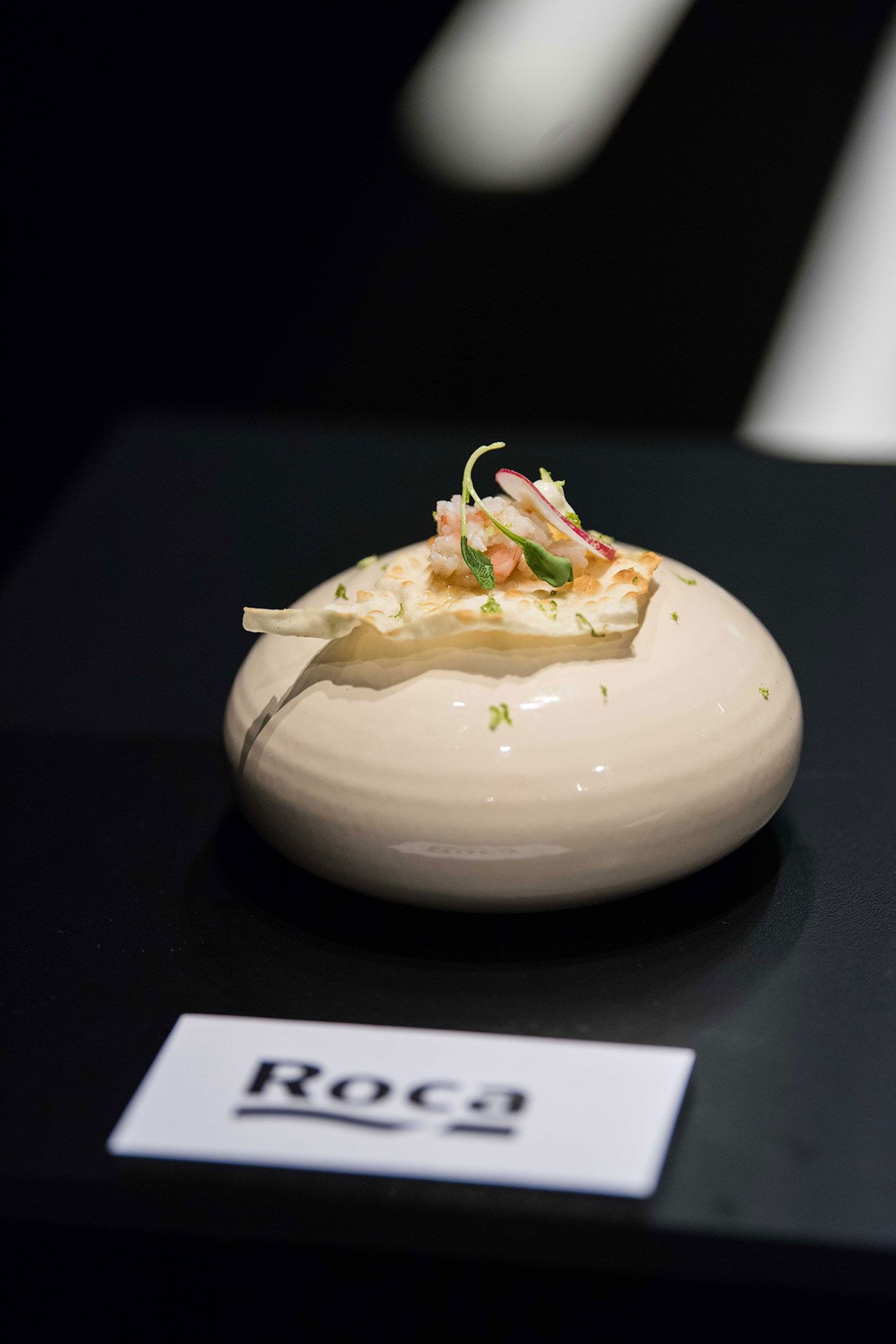 Como colofón, Luis Eslava presentó sus tapas de degustación, servidas cada una de ellas sobre platillos en forma de tótem con diseños distintos para cada firma. Un 'Carpaccio de gambas con rabanito, hinojo y algas', inspirado en una roca mediterránea en la orilla del mar, para Roca; 'Patatas de Olot' como conductor de energía, para Simon; 'Grisines de masa madre y semillas de girasol con hummus', con el Sol como fuente primordial y esencial de luz, para Marset; 'Paella Valenciana con romero y cuchara', como reflejo de la innovación y la tradición valenciana, para Actiu; 'Coca d’oli con escalivada', inspirada en la naturaleza, la organicidad y la madera, para Punt; y 'Pan con aceite y chocolate', en un guiño a la innovación de la cultura catalana, para Mobles 114.