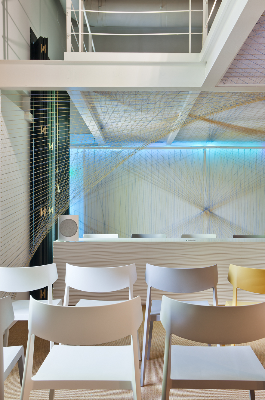 En el Auditorio, resuelto de manera ejemplar por los alumnos del Grado de Diseño de Interiores de ESNE, María Antón, una de sus creadoras, explicaba el proceso de trabajo: “Lo primero que hicimos a la hora de enfrentarnos a un auditorio era garantizar la acústica. Para ello hemos elegido materiales fonoabsorbentes en paredes y suelo. La nota especial la aporta un falso techo diseñado por nosotros y cubierto con tejidos que van creciendo en forma de arcos y dan ritmo al espacio. Una construcción de hilo y misal, materiales asociados con los comercios más tradicionales de Madrid y que se contrapone al resto de elementos que conforman el espacio, mucho más tecnológicos. En este sentido, quisimos disponer de la silla Wing de Actiu por ese marcado aspecto de innovación de esta silla, que supone una nueva manera de fabricar sillas de manera ligera, apilables y cómodas. Los colores de los hilos, blanco, mostaza y gris, coincide también con las tonalidades de las sillas dispuestas”.