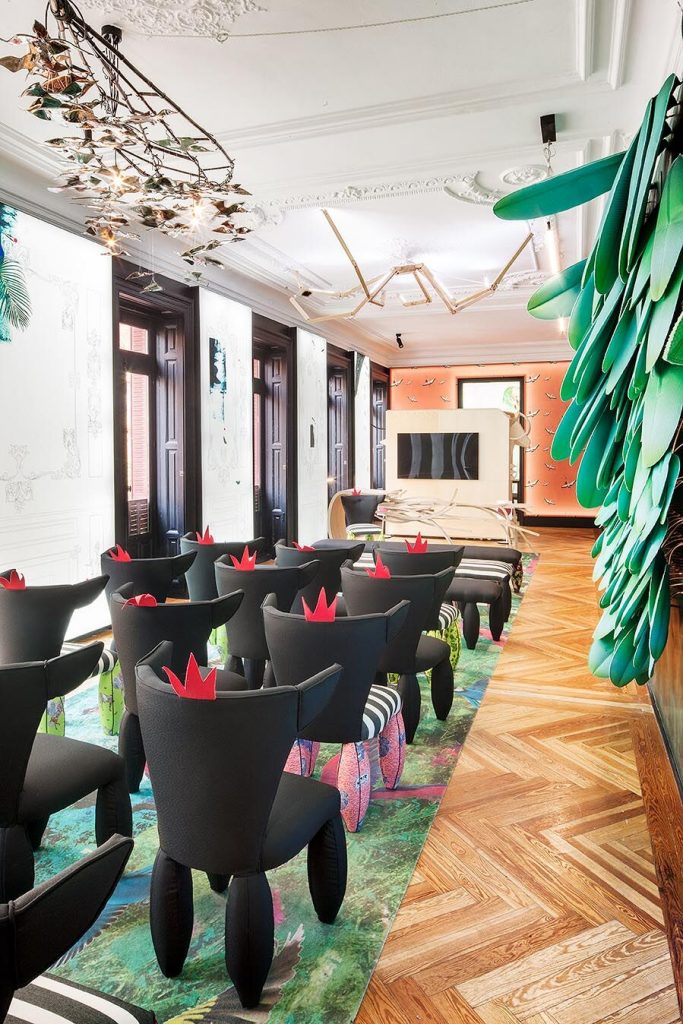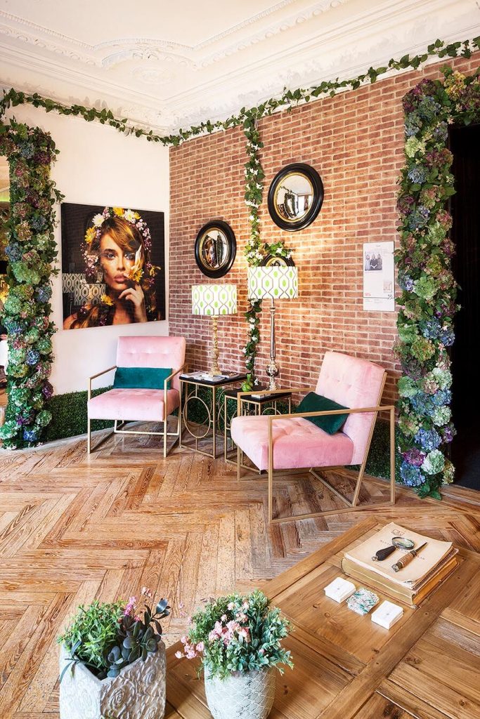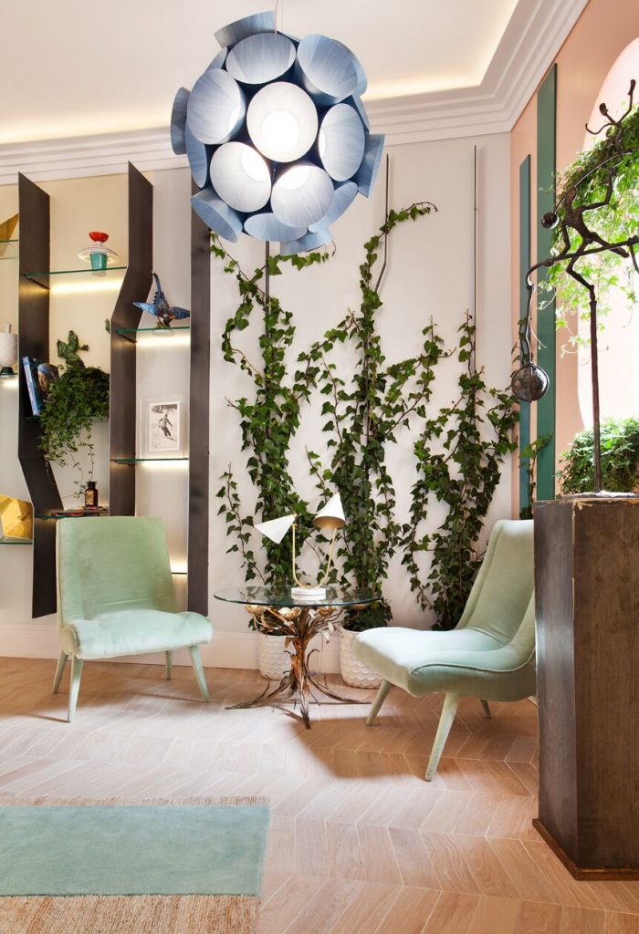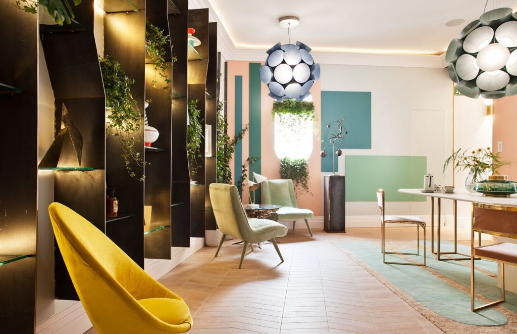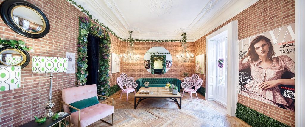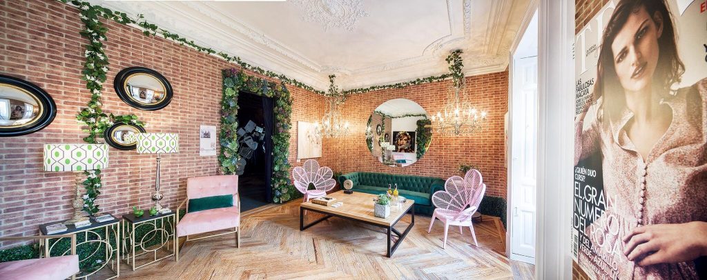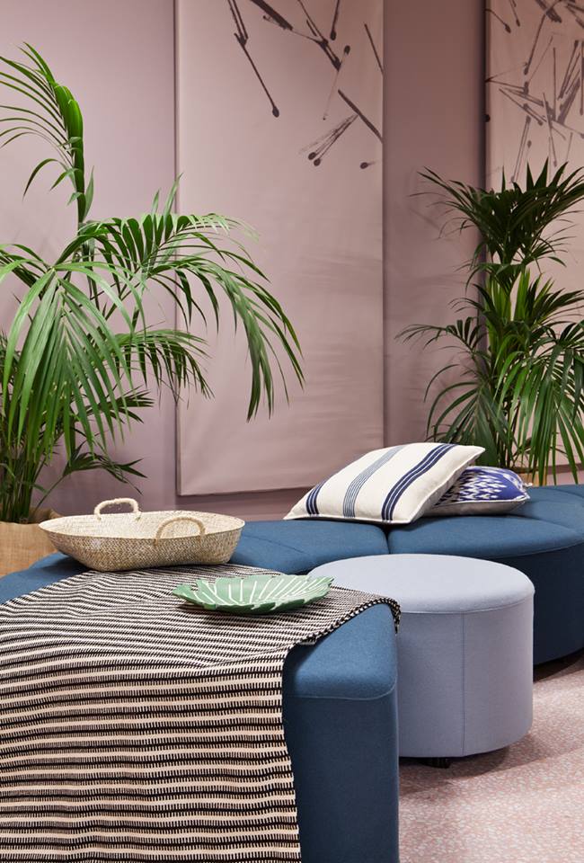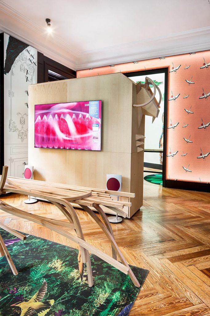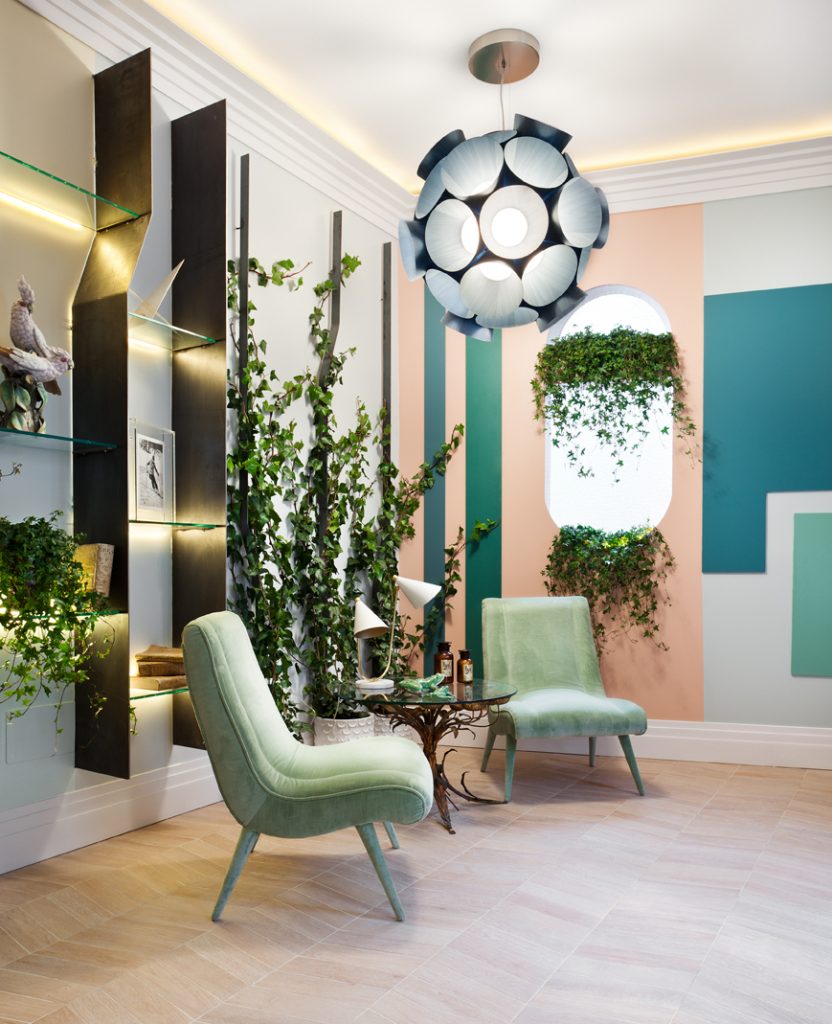 “Frente a concepciones culturales pasadas, en las que el rosa se veía como un color femenino, el rosa elegido para el lounge principal de Casa Decor se lee como un color sin género, o enfocado a un género más fluido” apunta María Antón-Barco, que destaca cómo este color es frecuentemente usado en el diseño de interiores para aportar confort y calidez. Un envoltorio neutro que combina a la perfección con el resto de colores empleados: el azul del soft seating Bend de Actiu, para tranquilizar y disminuir tensiones; y el verde de las plantas, que introduce la naturaleza en el interior.