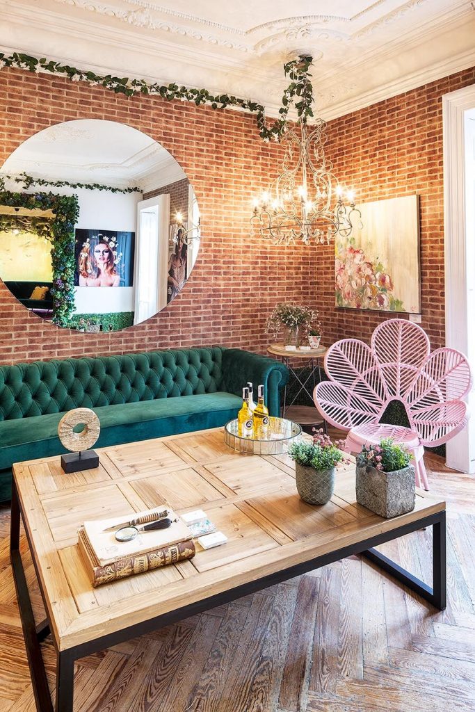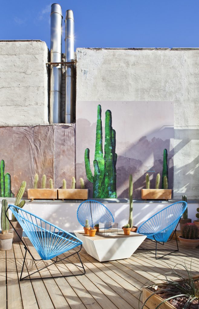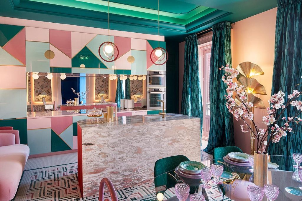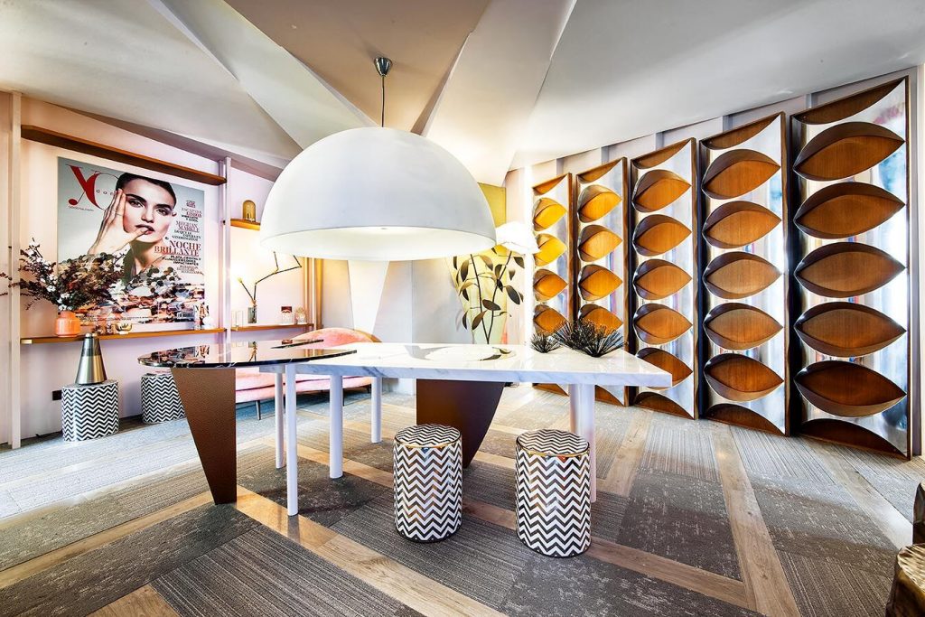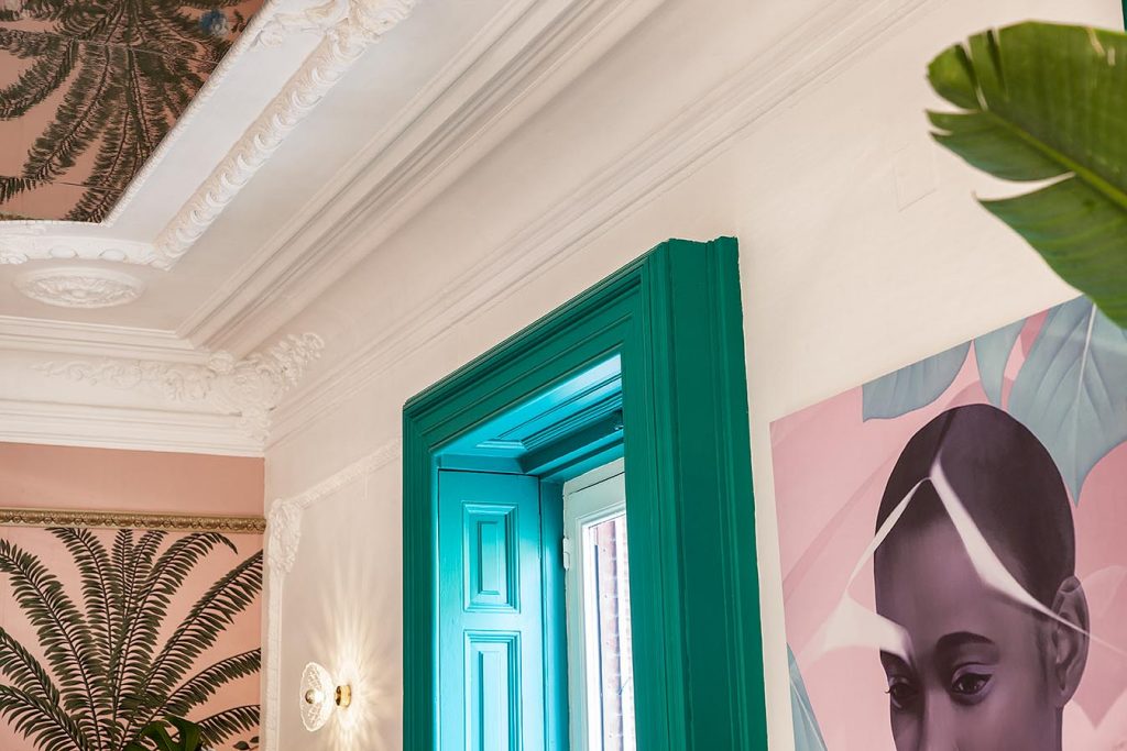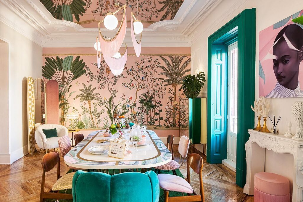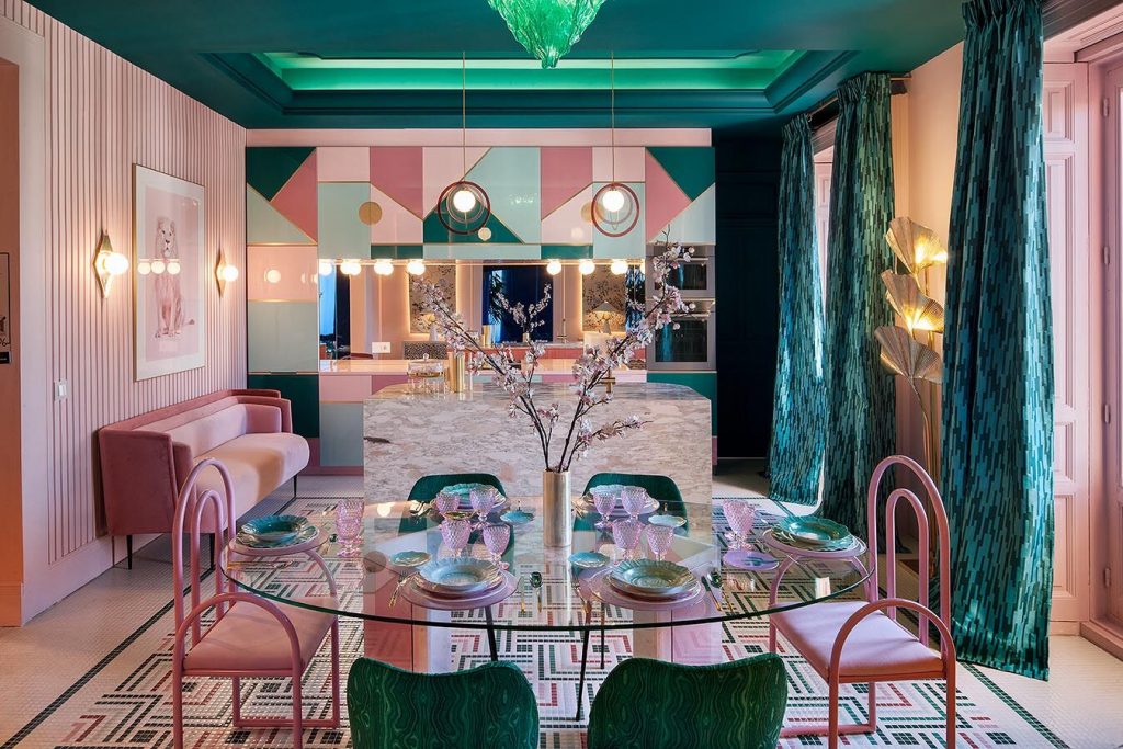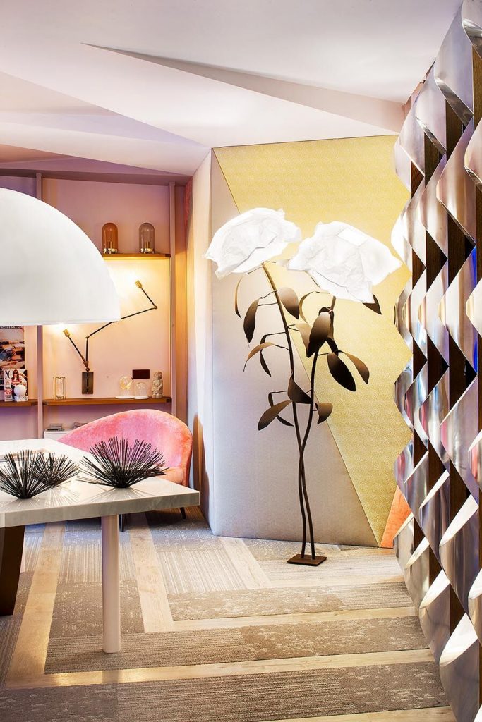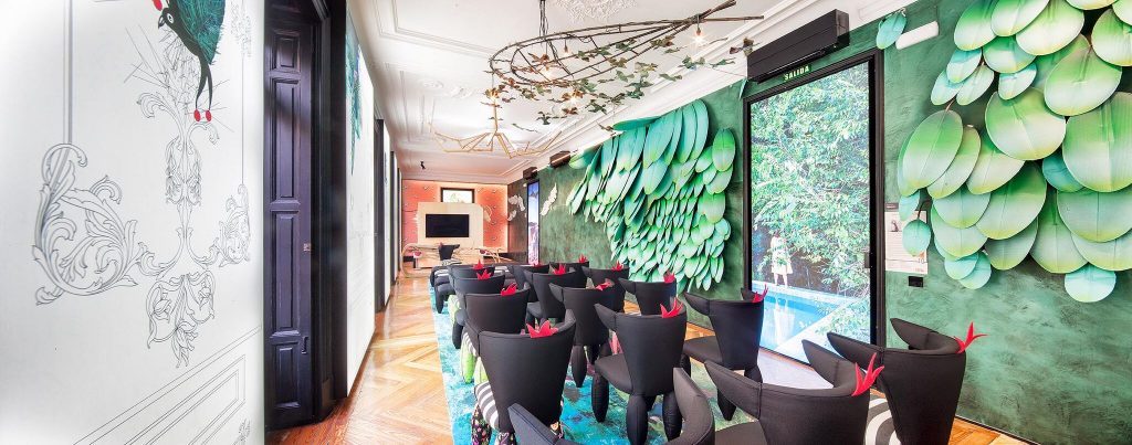 “Frente a concepciones culturales pasadas, en las que el rosa se veía como un color femenino, el rosa elegido para el lounge principal de Casa Decor se lee como un color sin género, o enfocado a un género más fluido” apunta María Antón-Barco, que destaca cómo este color es frecuentemente usado en el diseño de interiores para aportar confort y calidez. Un envoltorio neutro que combina a la perfección con el resto de colores empleados: el azul del soft seating Bend de Actiu, para tranquilizar y disminuir tensiones; y el verde de las plantas, que introduce la naturaleza en el interior.