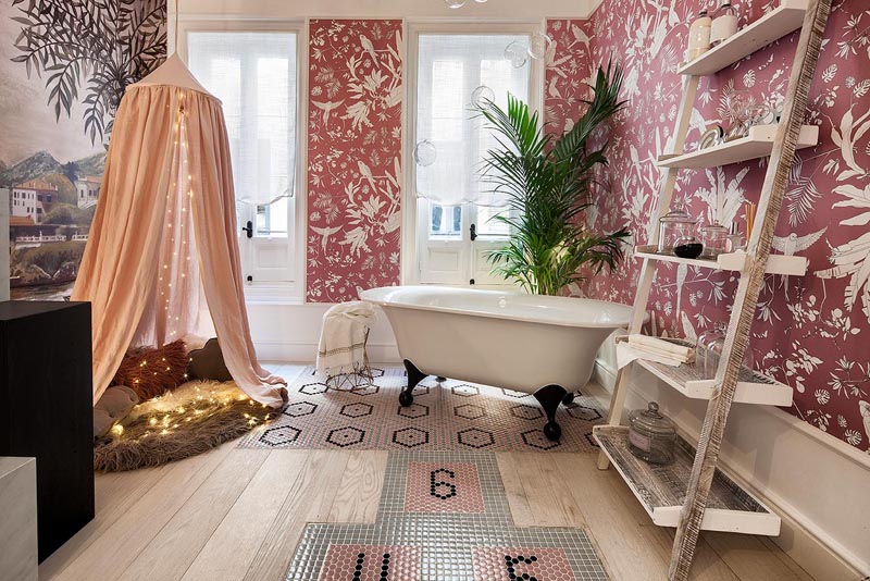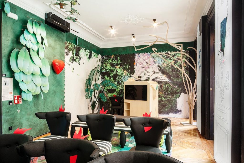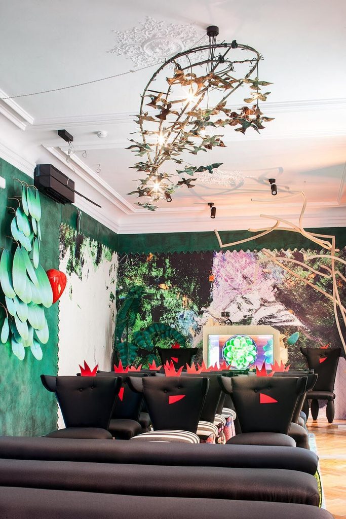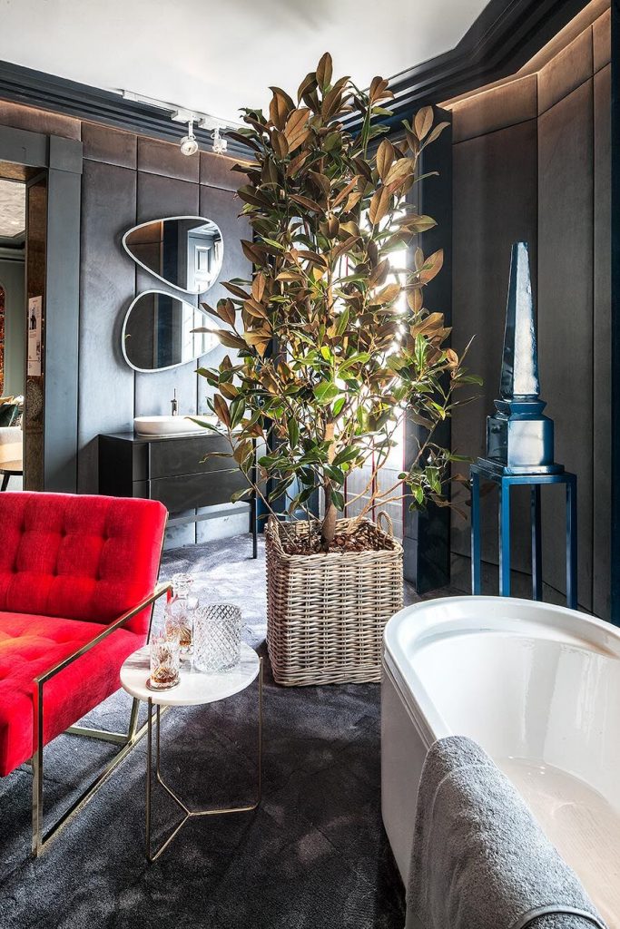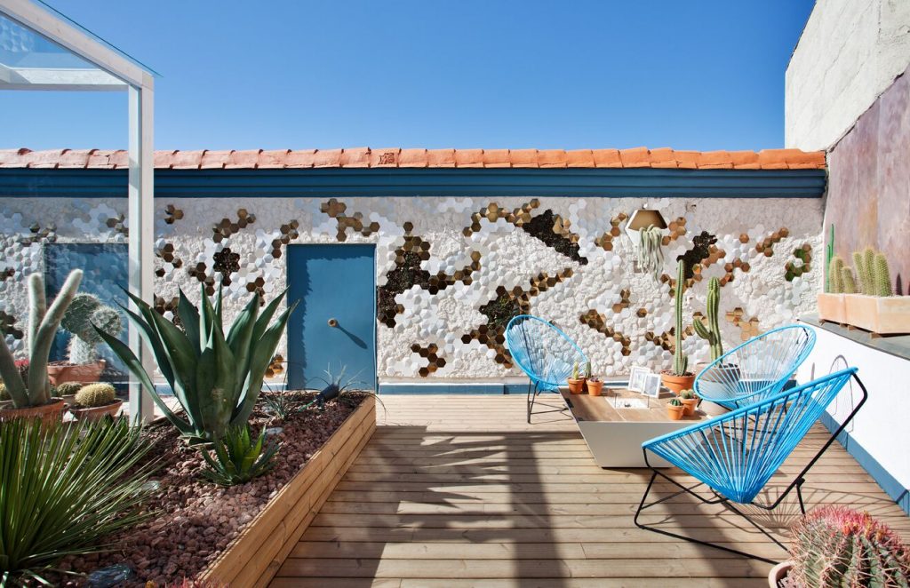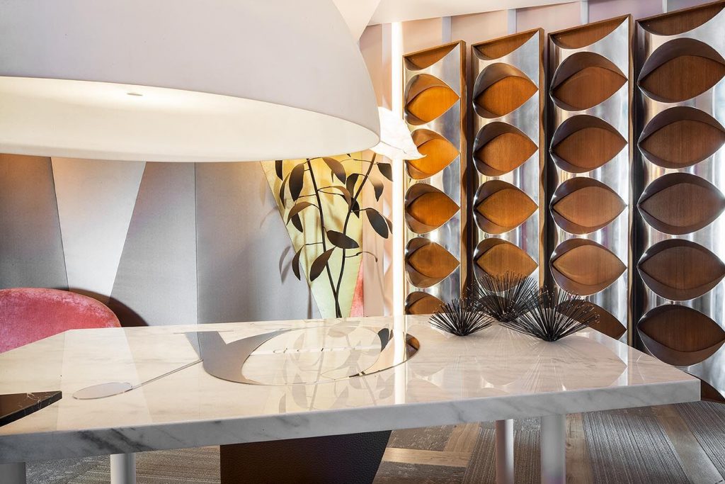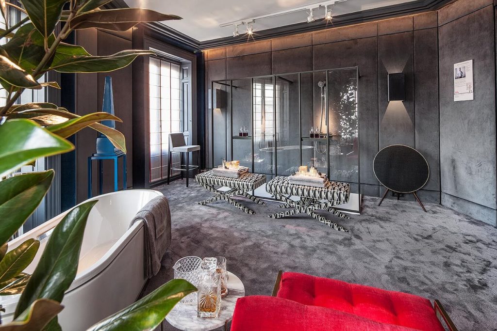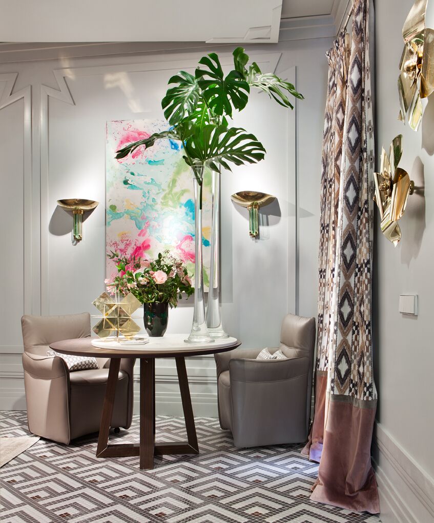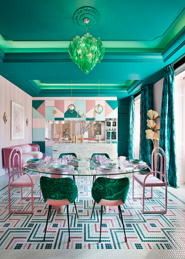 “Frente a concepciones culturales pasadas, en las que el rosa se veía como un color femenino, el rosa elegido para el lounge principal de Casa Decor se lee como un color sin género, o enfocado a un género más fluido” apunta María Antón-Barco, que destaca cómo este color es frecuentemente usado en el diseño de interiores para aportar confort y calidez. Un envoltorio neutro que combina a la perfección con el resto de colores empleados: el azul del soft seating Bend de Actiu, para tranquilizar y disminuir tensiones; y el verde de las plantas, que introduce la naturaleza en el interior.