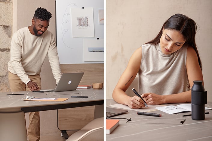 El tacto conecta directamente con nuestra sensación de confort. Sentarse en una silla ergonómica que se adapta al cuerpo, trabajar en una mesa regulable o apoyar las manos sobre superficies agradables cambia por completo la experiencia de trabajo.