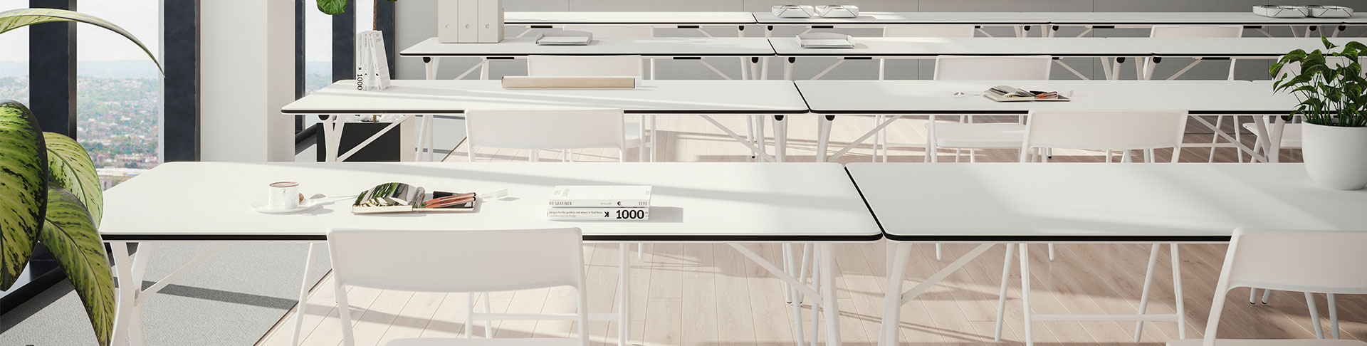 El reducido volumen que ocupa Plek colocada en su carro (de capacidad de hasta 10 mesas), facilita su transporte y optimiza el espacio de almacenaje.