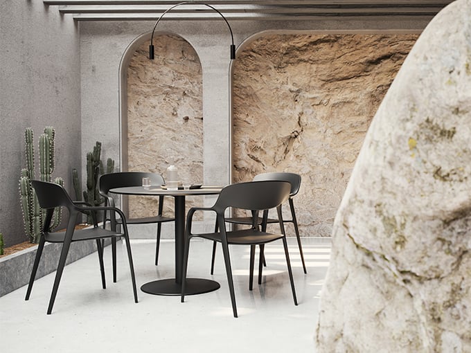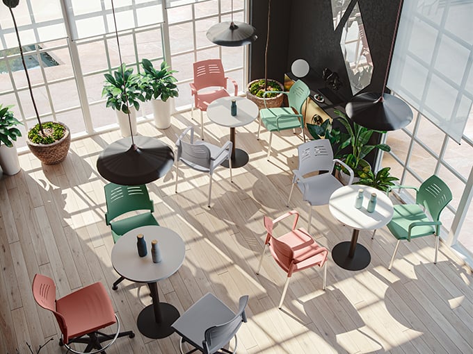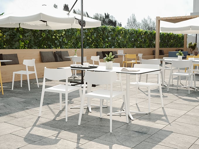 La posibilidad de elegir entre mesa redonda o cuadrada y combinar colores y tipos de pata permiten al programa Tabula crear espacios colectivos contract que se adaptan a las necesidades de cada negocio.