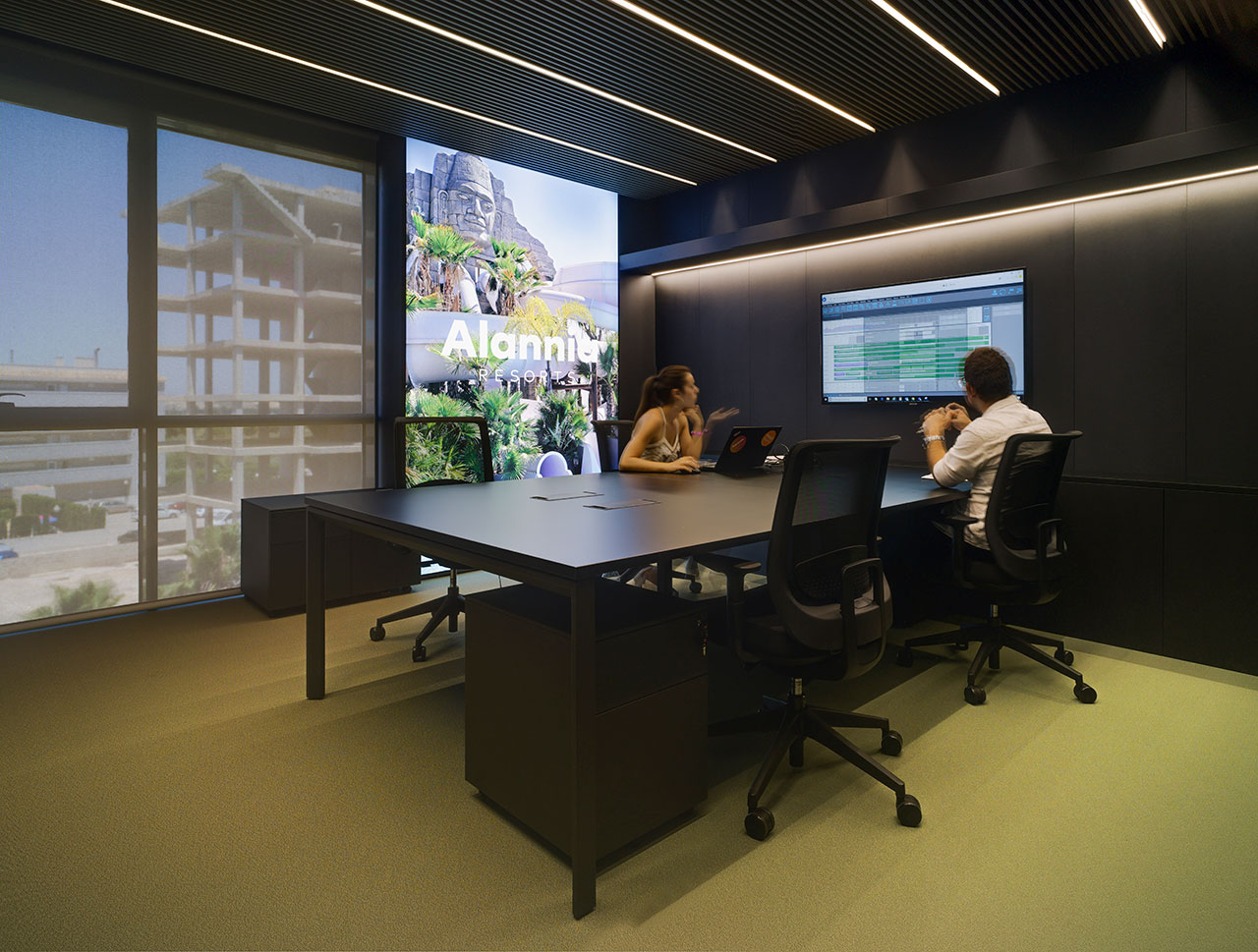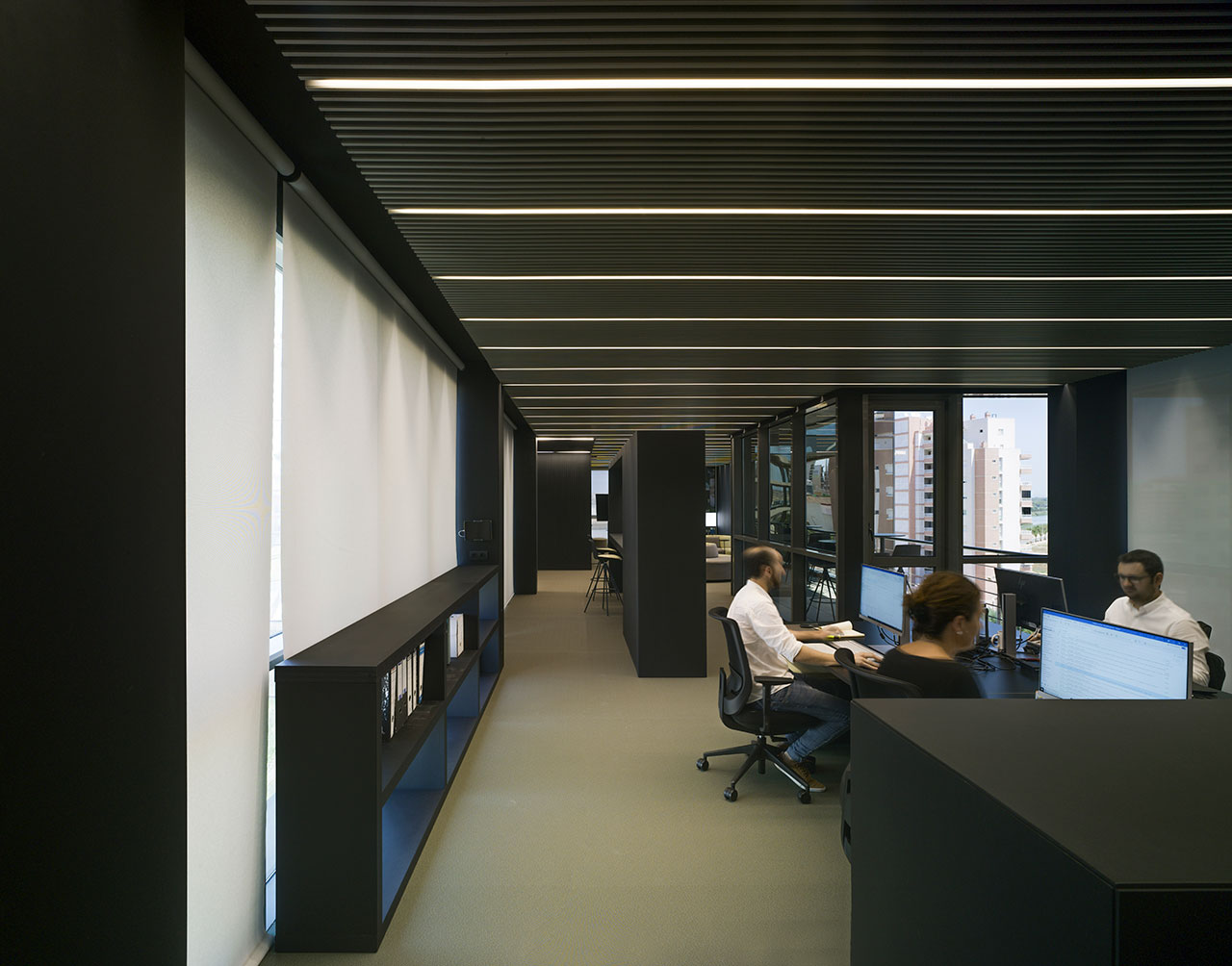 La elegancia del color negro equipa las diferentes áreas de open space donde los miembros del equipo desarrollan sus tareas individuales.