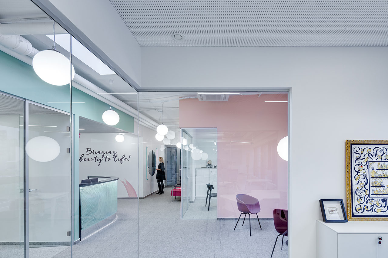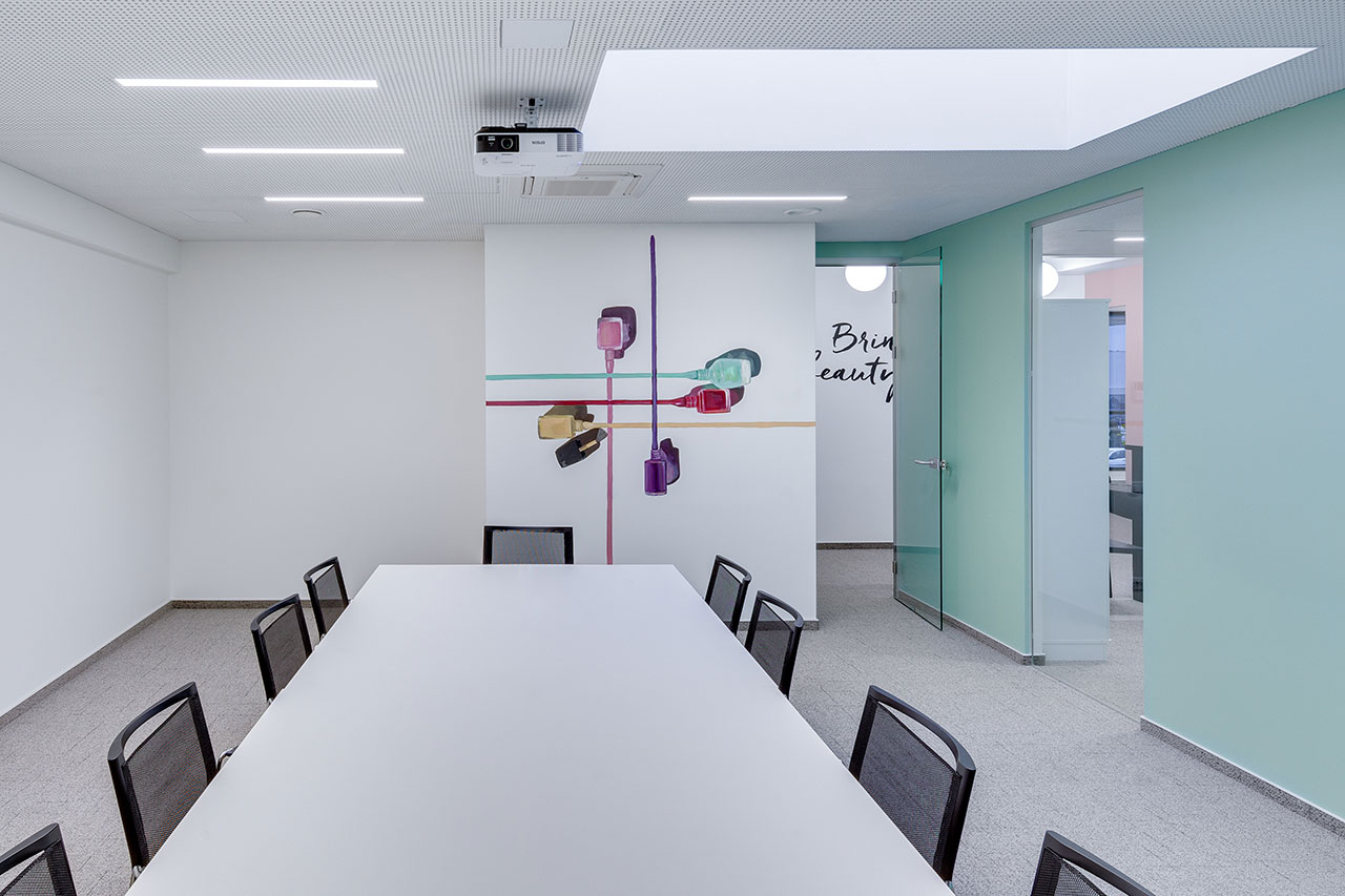 El mobiliario se ha personalizado con los colores brillantes y corporativos de Douglas, aplicados también a las creaciones artísticas que habitan las paredes de estas oficinas.