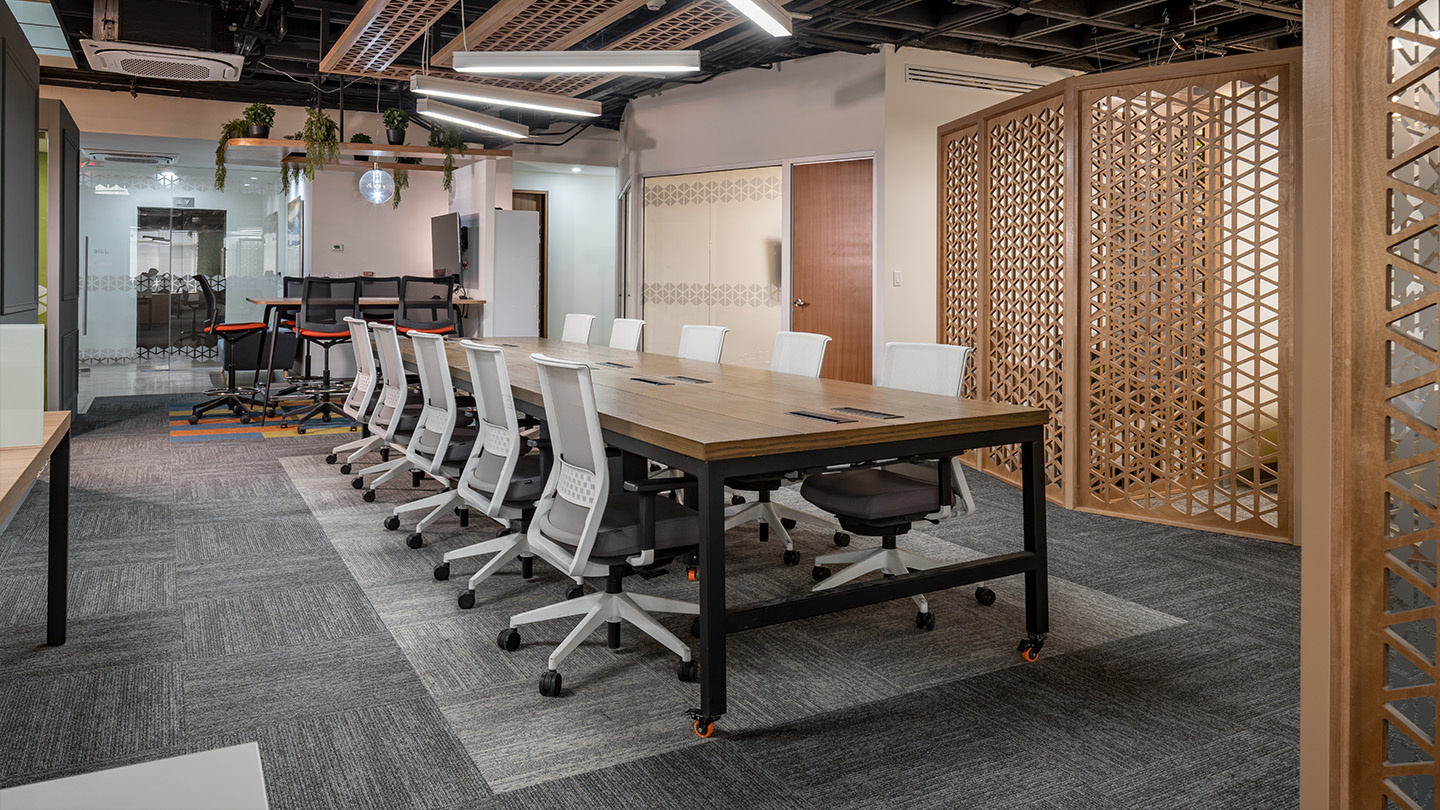 Fundamental en este tipo de espacios abiertos, el confort acústico se potencia a través del uso de materiales absorbentes, como la madera, materializada en una celosía que además funciona como elemento decorativo y sello del proyecto; los tapizados o las alfombras.