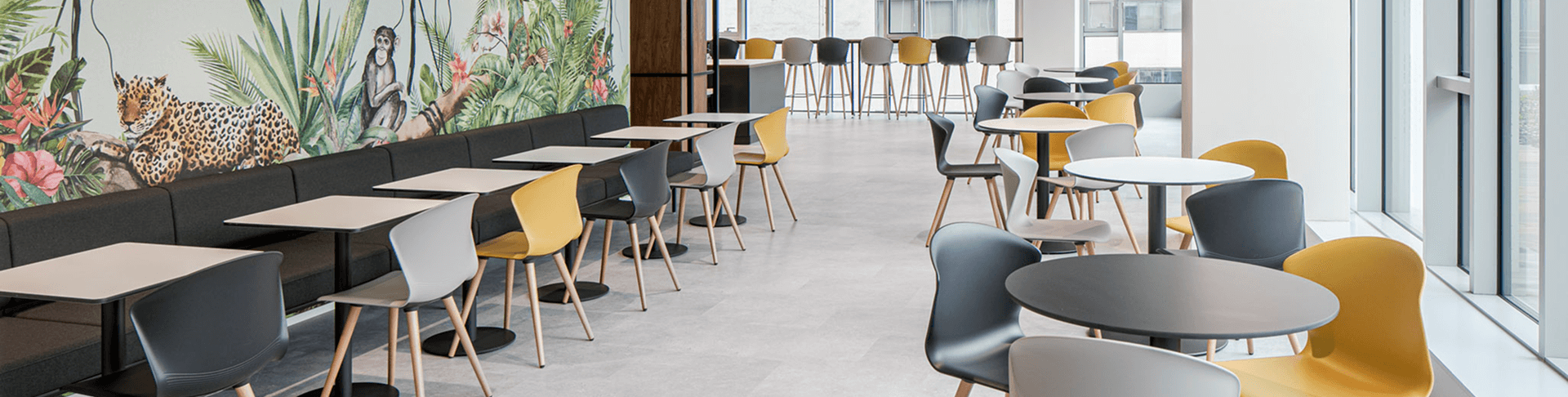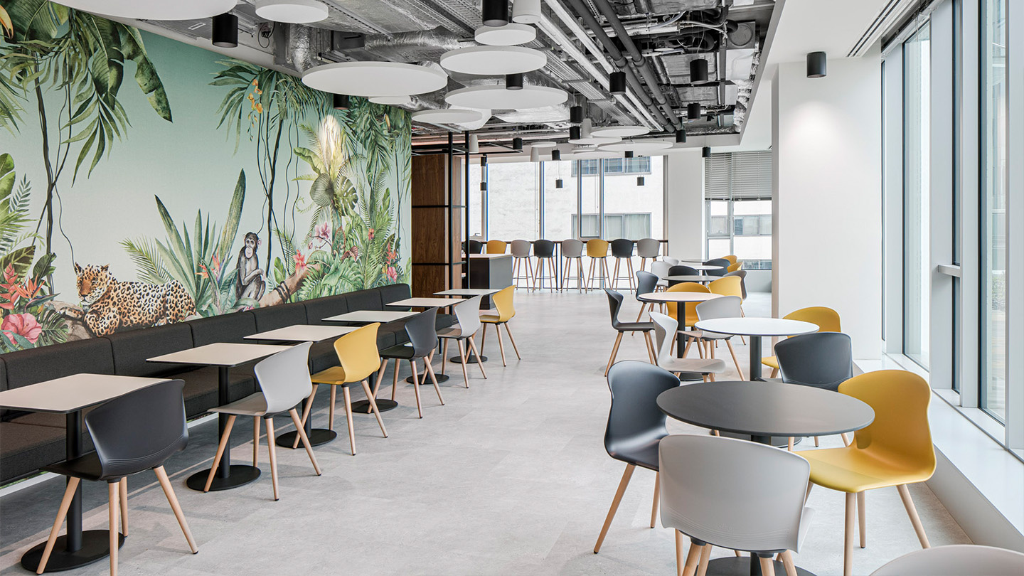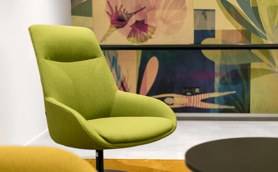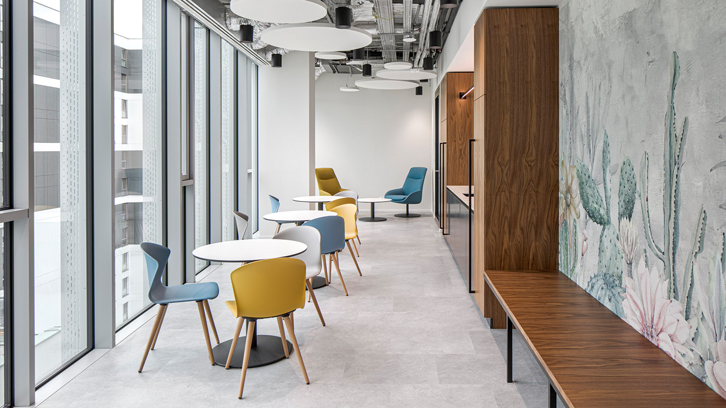 Mesas Prisma y sillas Noom aportan a la sala de reuniones un carácter cálido y al mismo tiempo elegante; mientras que en la destinada a presentaciones o eventos se ha optado por la silla Wingen, apilable y que facilita el cambio de uso. Otros espacios 'no oficiales' se intercalan por las oficinas para potenciar la comunicación y el intercambio de ideas, con programas como Bend, Longo, Badminton o Whass, teñidos de colores más lúdicos y alegres y que recrean entornos a medio camino entre la oficina y los espacios de contract o restauración.