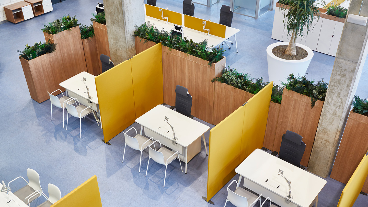 En la planta destinada al SEPE, y para lograr una mayor fluidez y transparencia, la zona de espera se divide en varias áreas envueltas por unos listones de madera que aportan privacidad y al mismo tiempo permiten a los visitantes entrever lo que ocurre en la gran zona diáfana de trabajo y atención al público. Para favorecer este dinamismo y comunicación, el open space operativo se equipa con mesas Twist; junto a paneles separadores Link, armarios modulares y unas taquillas rematadas por jardineras que ayudan a separar ambientes sin renunciar a la continuidad espacial.