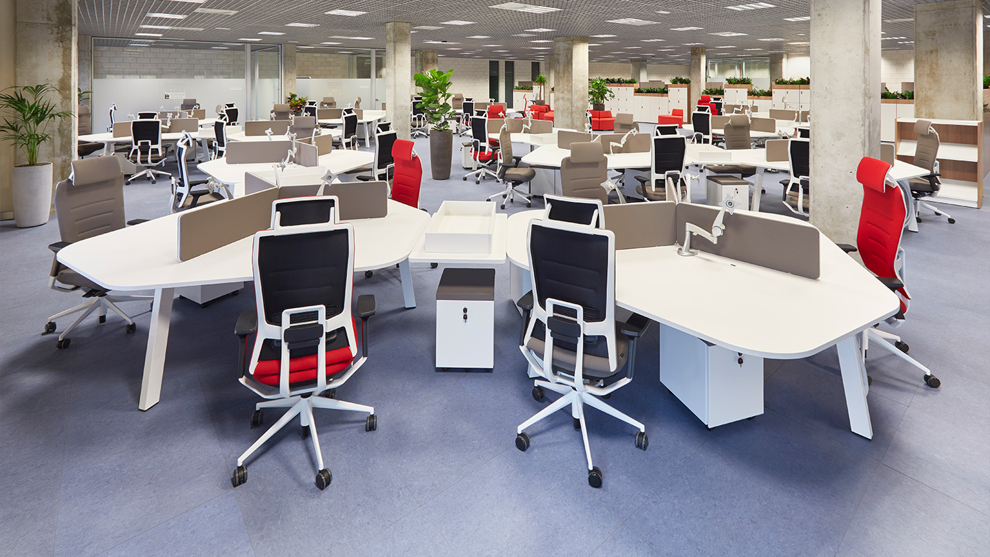 En la planta reservada a la Dirección General del Servicio Público de Empleo de la Comunidad de Madrid se añade el color rojo corporativo a determinadas piezas de mobiliario, como los módulos Bend de las zonas de encuentro y espera, y algunas sillas operativas del open space. Programas como las mesas Arkitek o las sillas de dirección Cron aportan un toque distintivo y más elegante a los despachos; mientras que en las aulas de formación se opta por soluciones fácilmente plegables y apilables, como las mesas Talent y las sillas Noom 50.